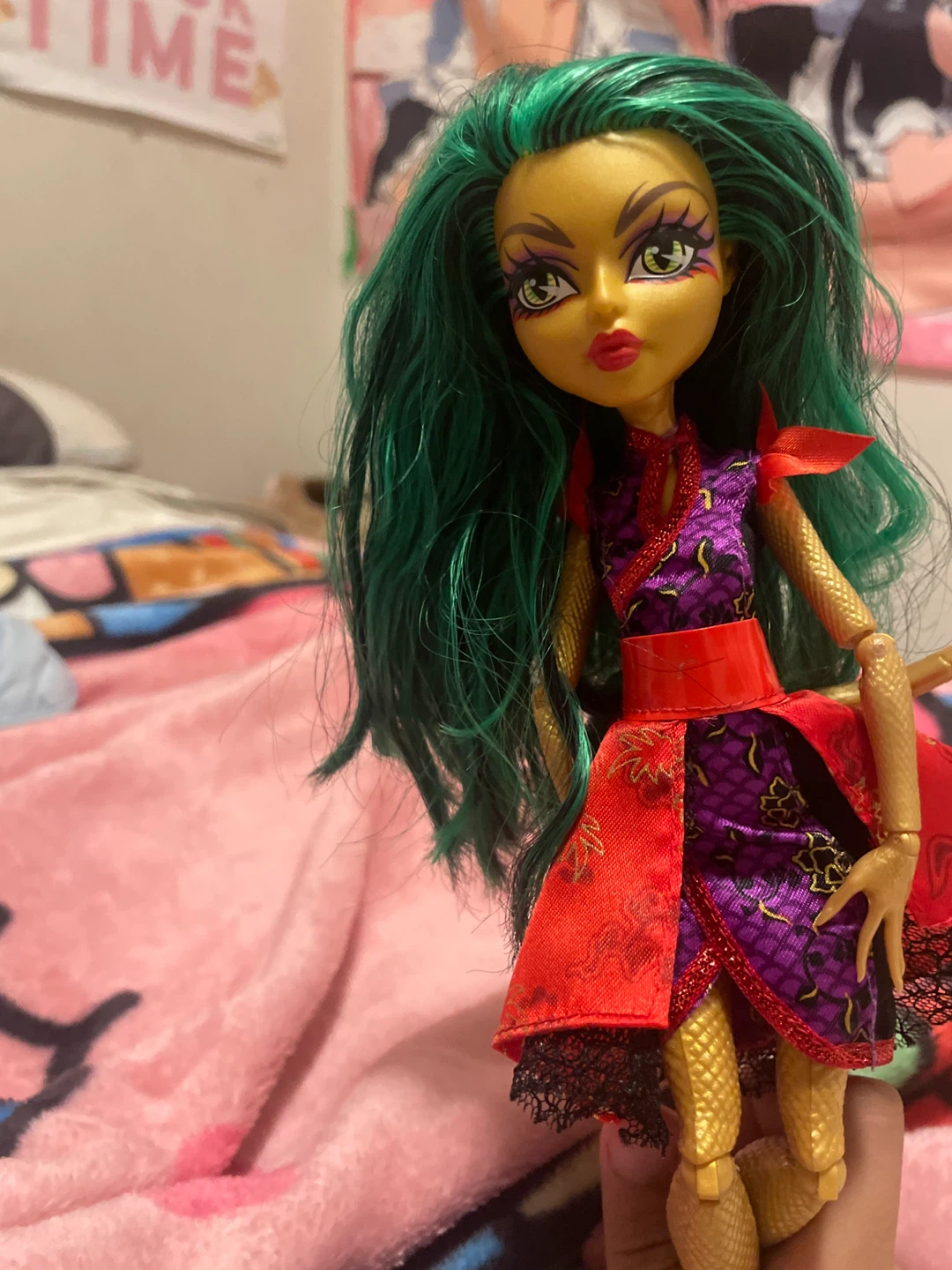 Selling a Monsterhigh jinafire doll! She has green hair and is wearing a red and purple dress. She's in great condition! Missing some accessories