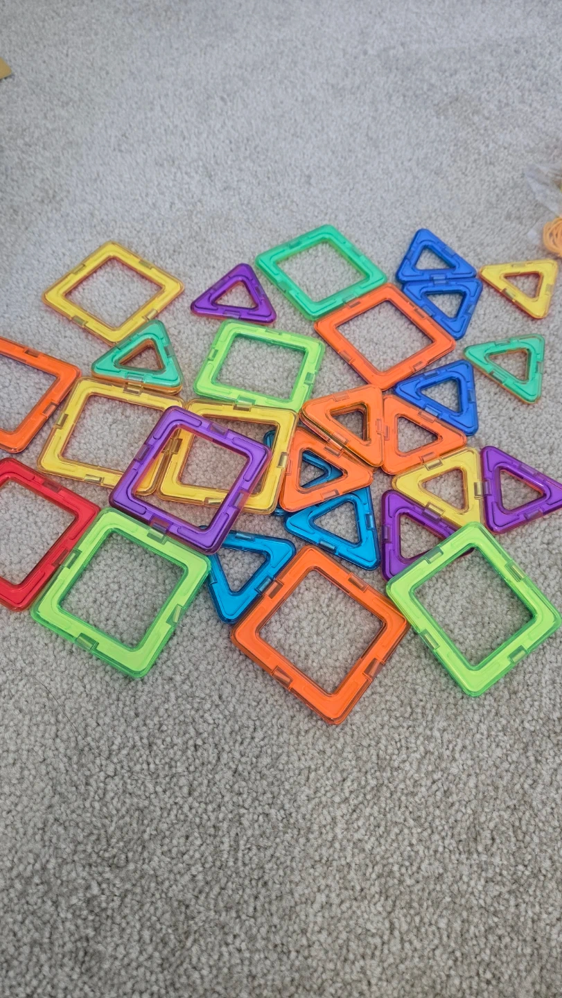 A colourful set of magnetic tiles, including squares and triangles. These magnetic building blocks are great for creative play and developing fine motor skills. They're made of durable plastic and come in assorted bright colours.
