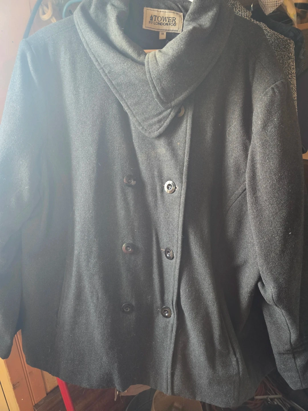 This peacoat from Tower by London Fog is a classic grey colour. It's a size 3X. Double-breasted button closure and a stylish collar. Made from a blend of materials, it's a warm choice for cooler weather.