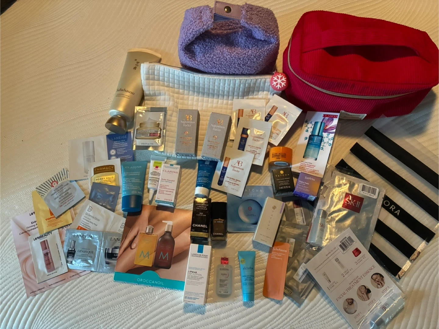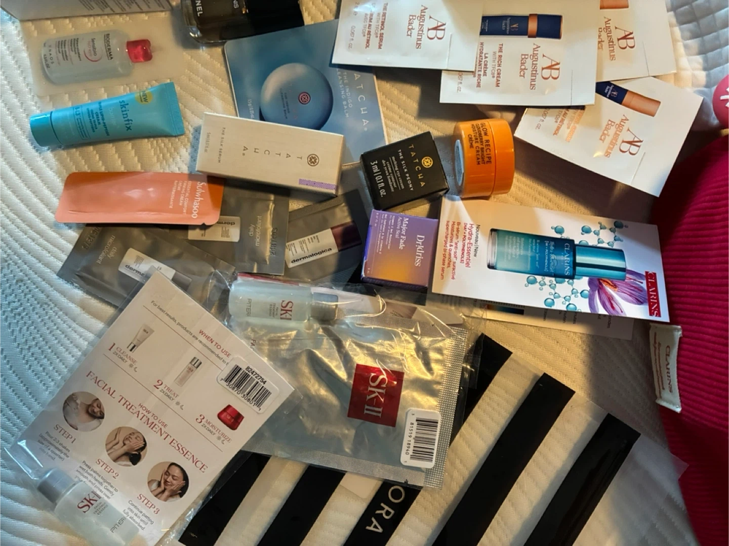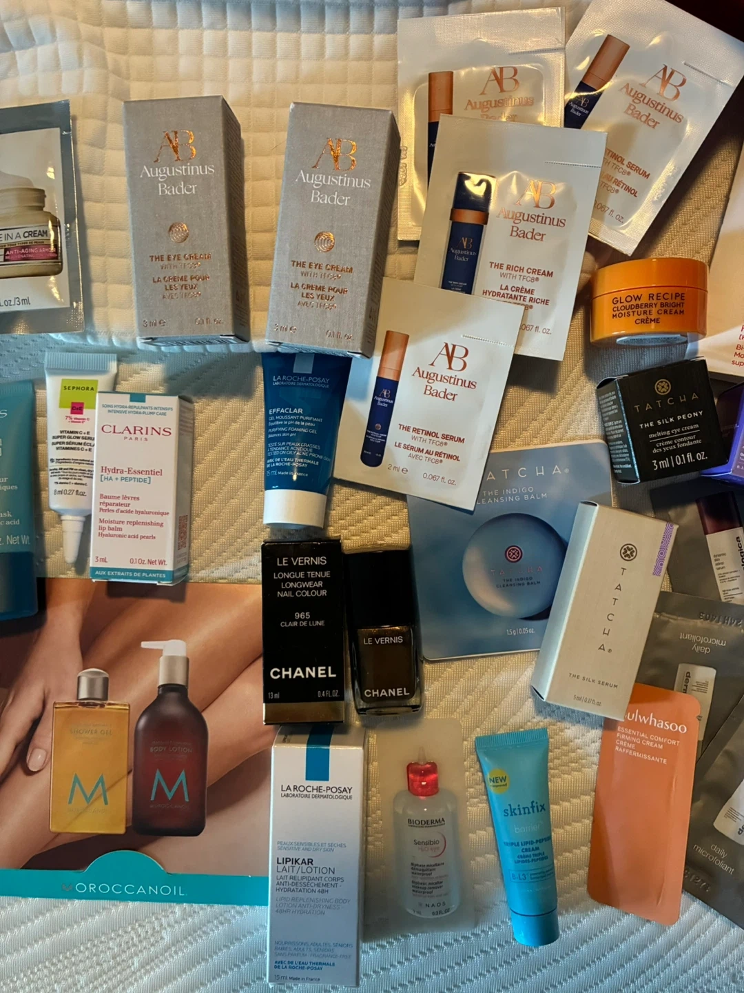 Selling a variety of skincare samples and travel-sized items from brands like Chanel, Sulwhasoo, Clarins, Tatcha, Augustinus Bader, and more! Highlighting: Chanel full nail polish Clare Da lune (khaki pearl ) Sulwhasoo mask 100 ml 3 types of make up bag( Tatcha teddy purple bag, Clairins red corduroy bag, Clarins white soft zipper pouch)