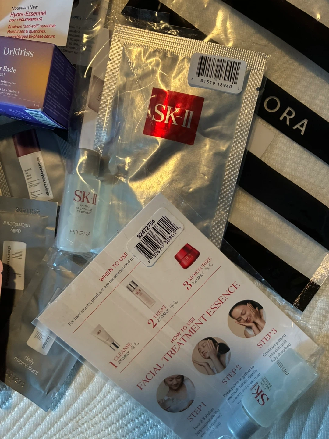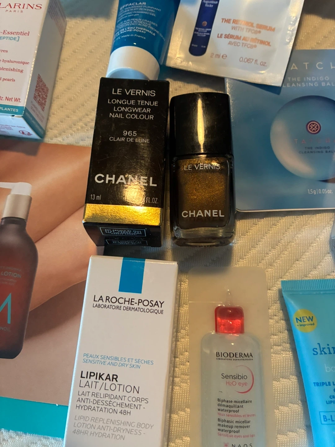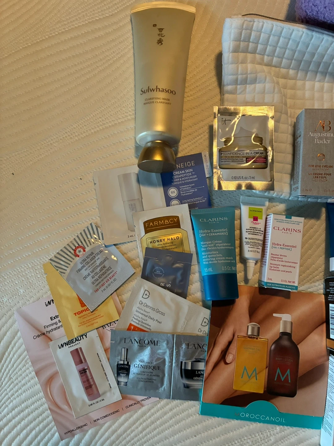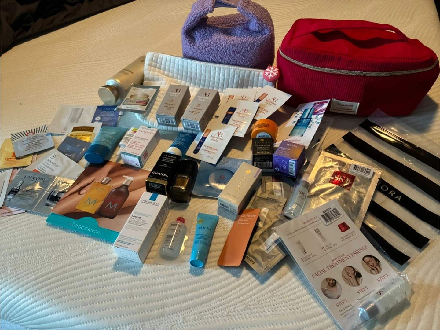 Selling a variety of skincare samples and travel-sized items from brands like Chanel, Sulwhasoo, Clarins, Tatcha, Augustinus Bader, and more! Highlighting: Chanel full nail polish Clare Da lune (khaki pearl ) Sulwhasoo mask 100 ml 3 types of make up bag( Tatcha teddy purple bag, Clairins red corduroy bag, Clarins white soft zipper pouch)