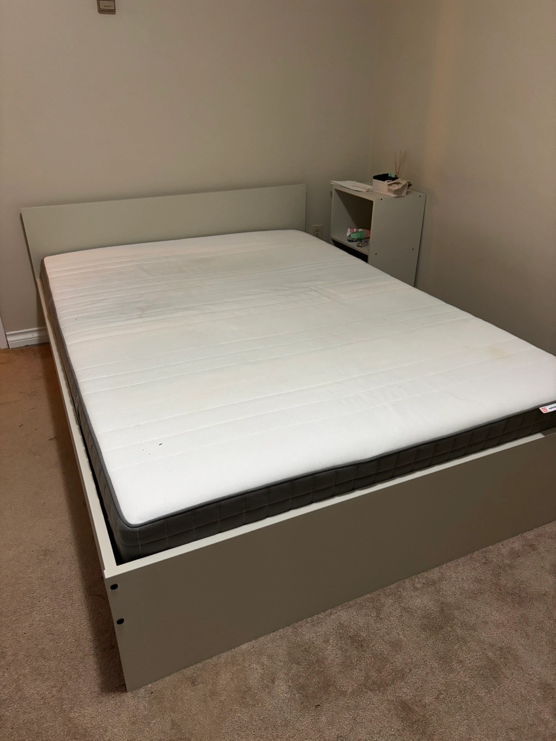 Selling a sturdy and clean full-size bed frame with a comfortable mattress due to an urgent move. Both are in great condition and ready for immediate pick-up.