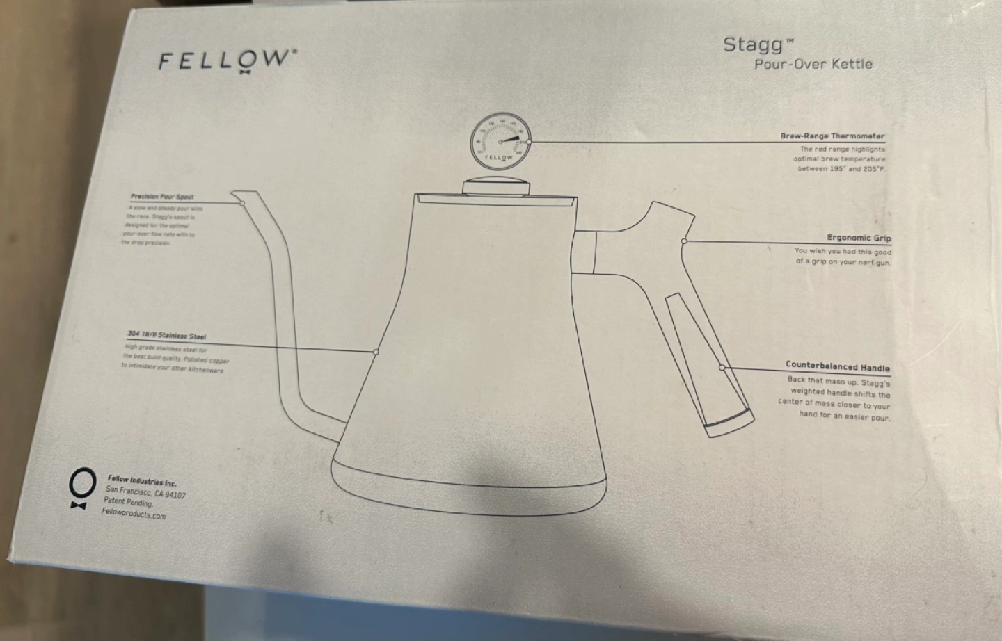 Stainless steel kettle with a polished copper finish. Features a brew-range thermometer, precision pour spout, and a counterbalanced handle.