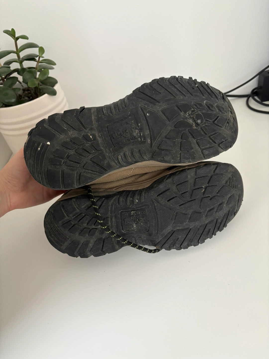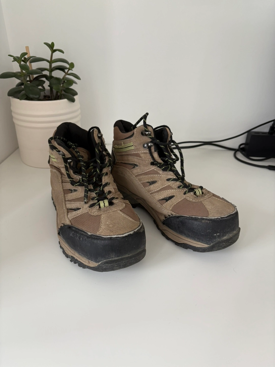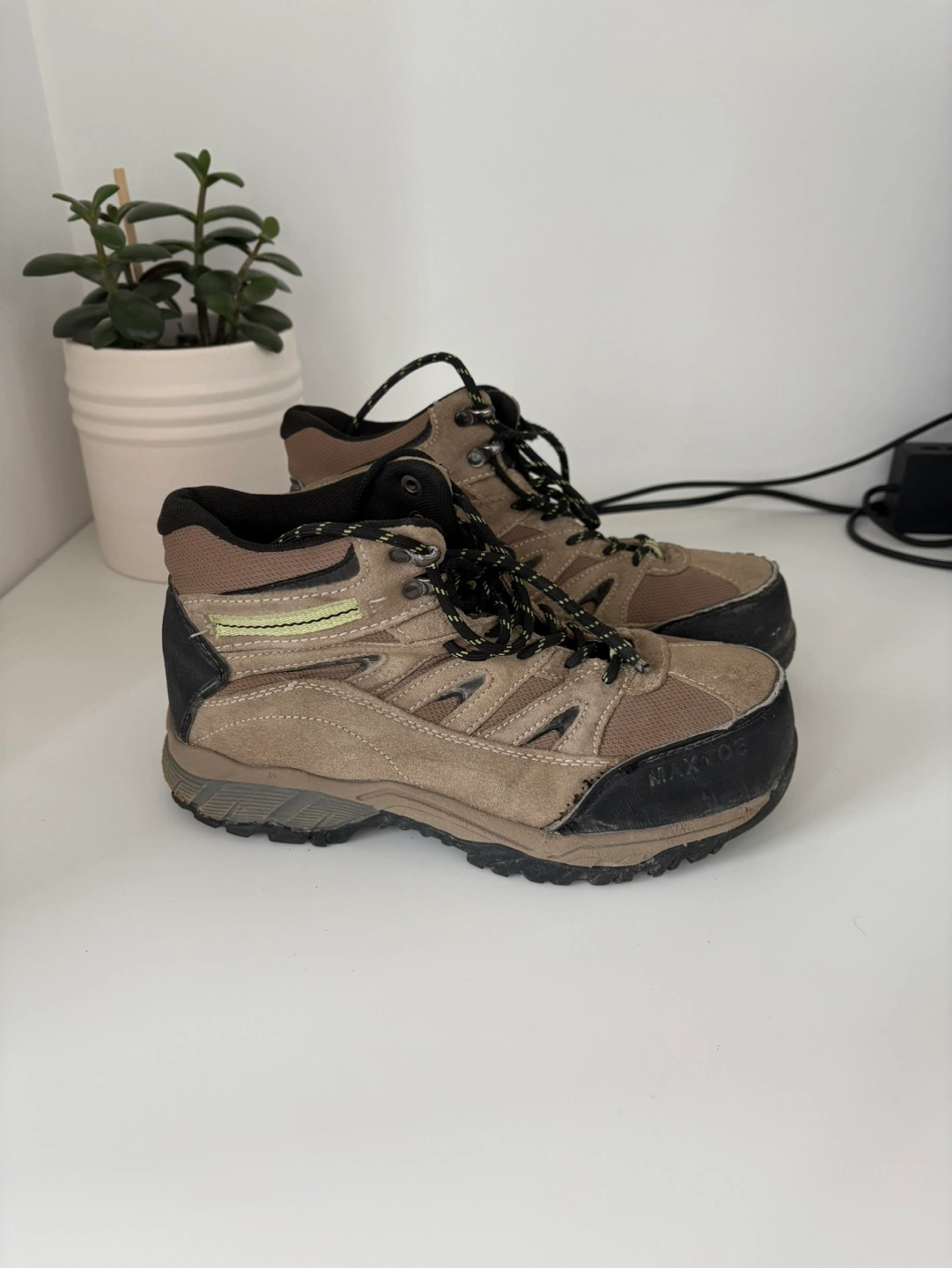 Safety boots with the green triangle, I wore them at a construction site for a short summer job and no longer need them. Got these from Walmart for about $90. You are welcome to try them on before buying.