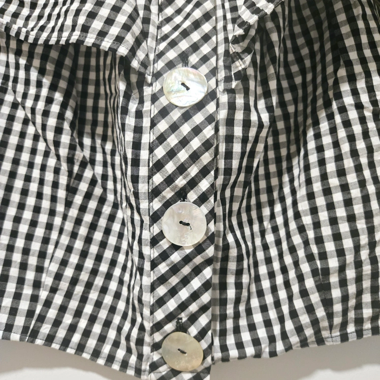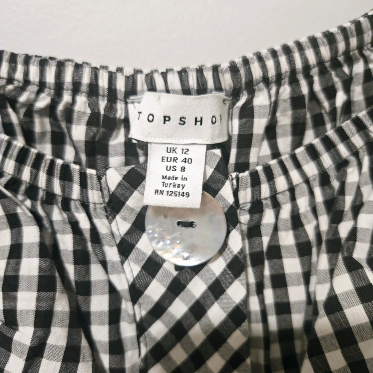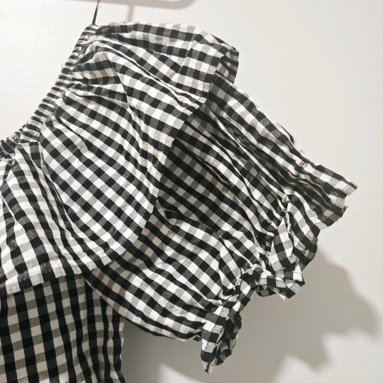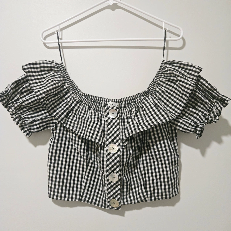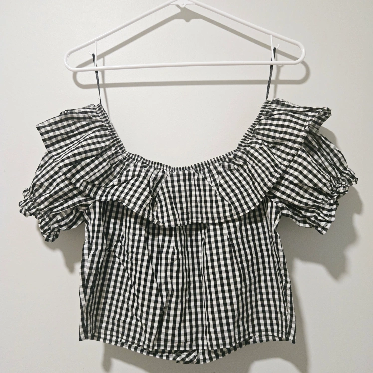 55Black and white gingham off-the-shoulder top with short sleeves and button closure. Brand new without tag