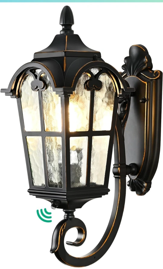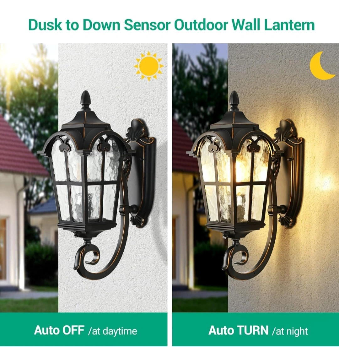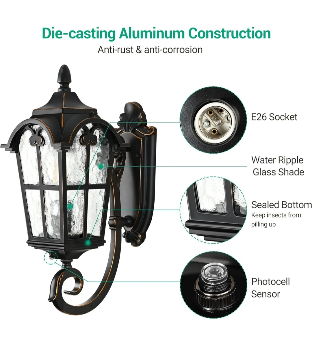 Weatherproof, anti-rust, and anti-corrosion outdoor wall lantern. Features a water ripple glass shade and a photocell sensor. Includes a sealed bottom that keeps insects from entering.