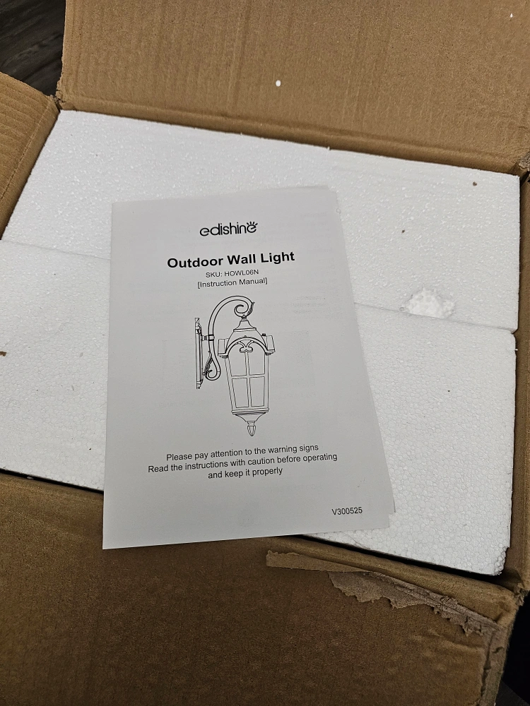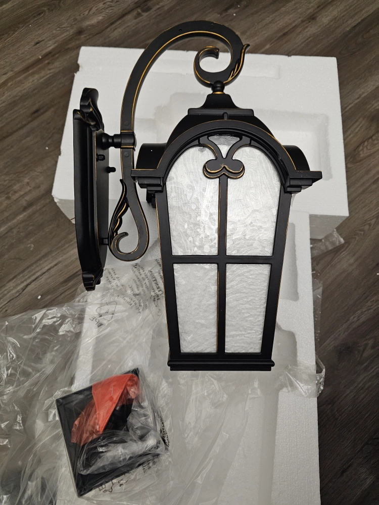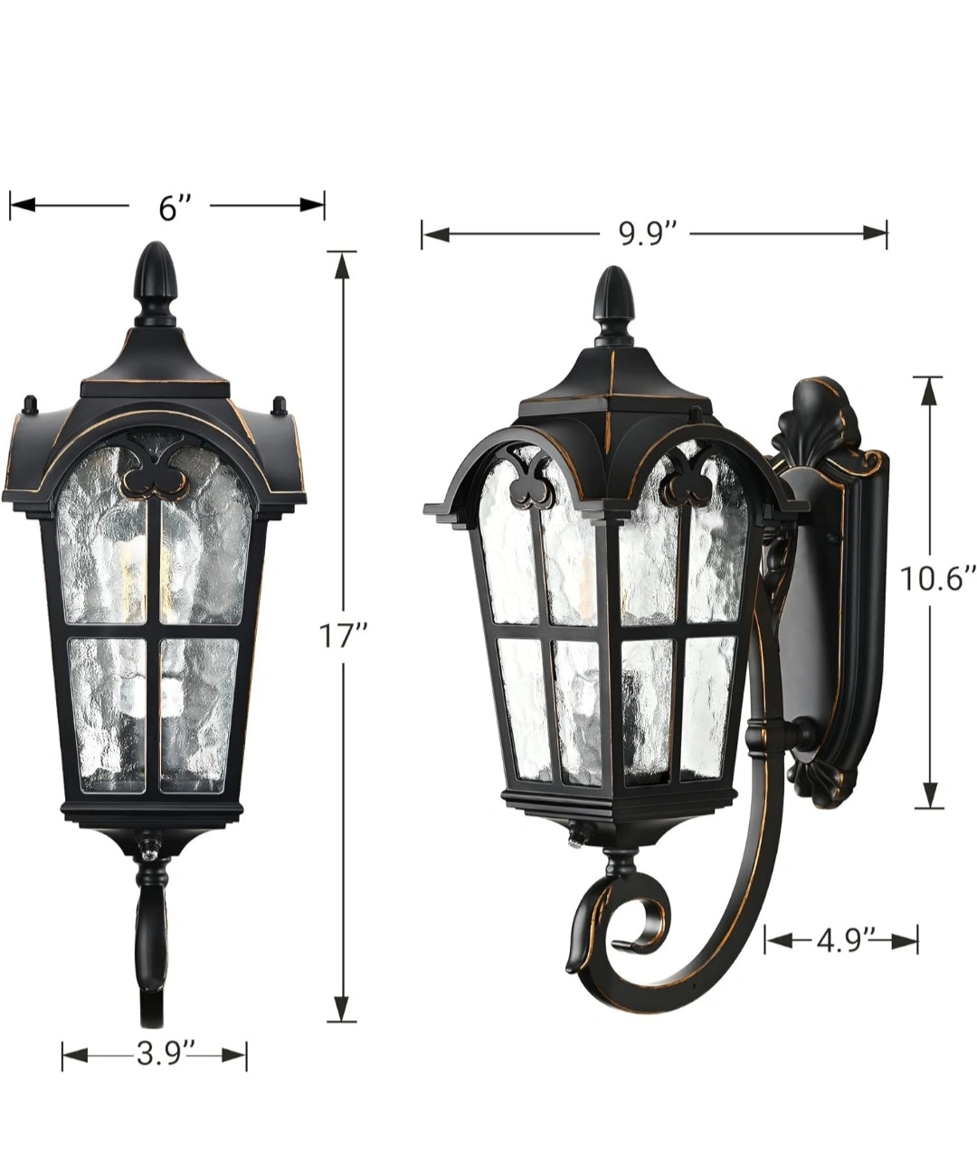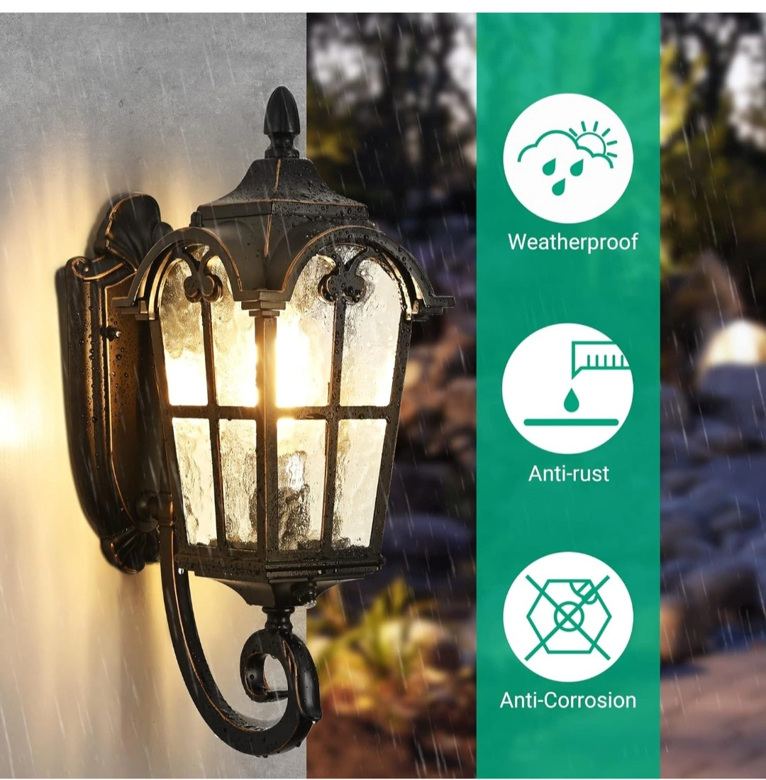 Weatherproof, anti-rust, and anti-corrosion outdoor wall lantern. Features a water ripple glass shade and a photocell sensor. Includes a sealed bottom that keeps insects from entering.