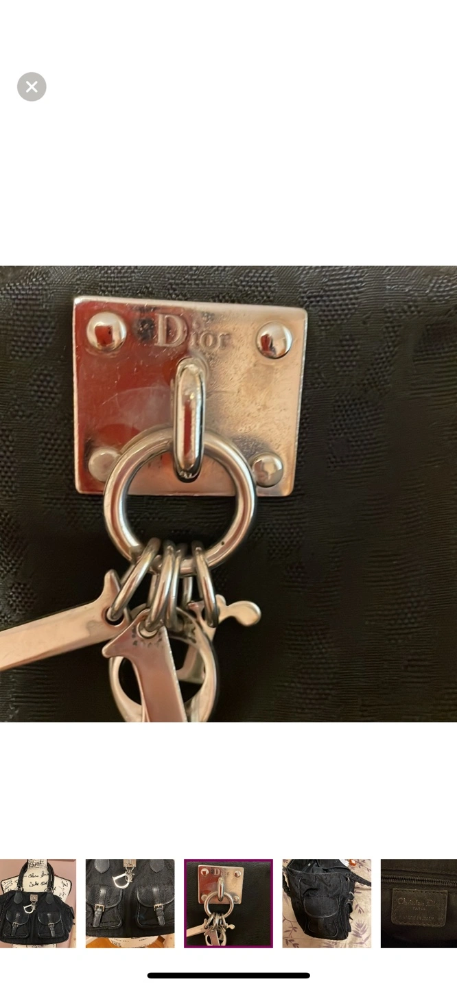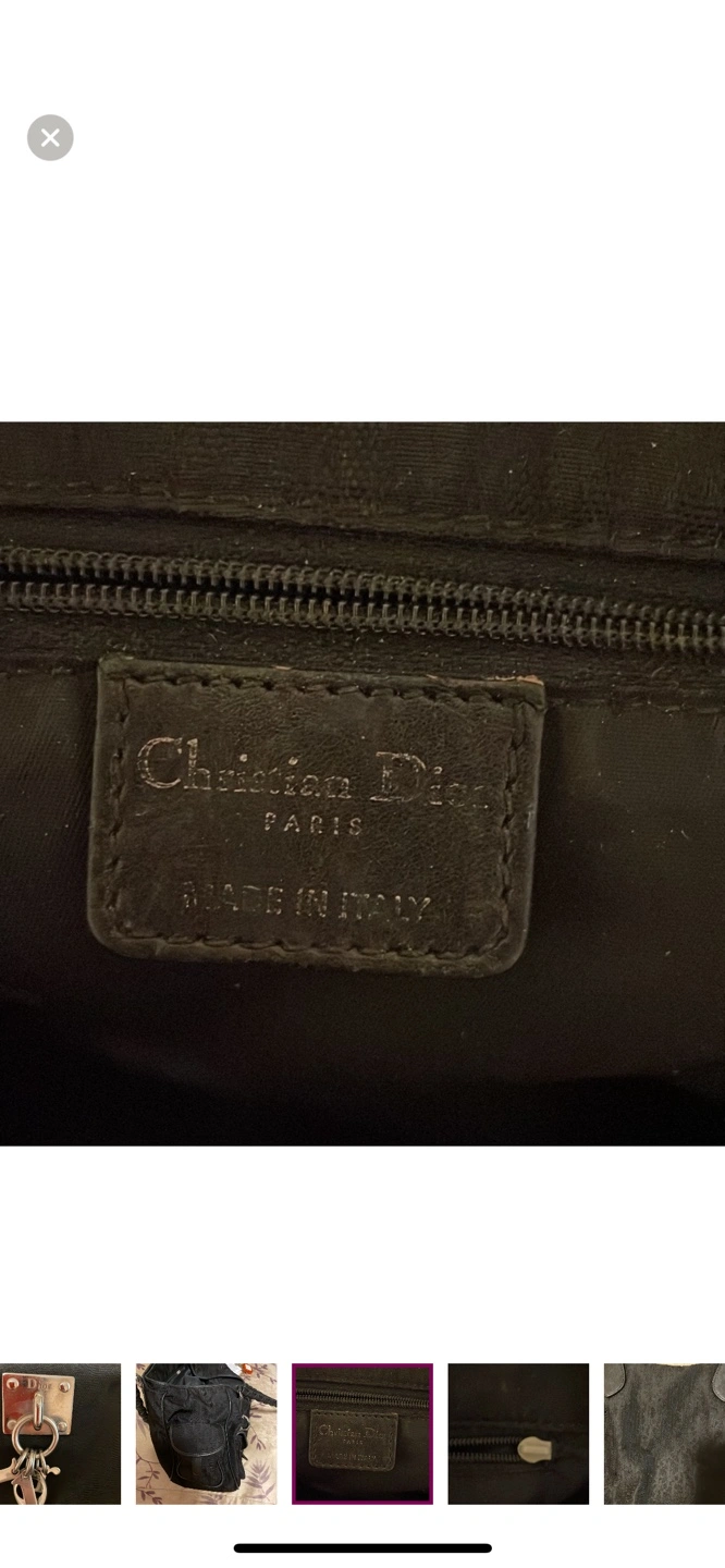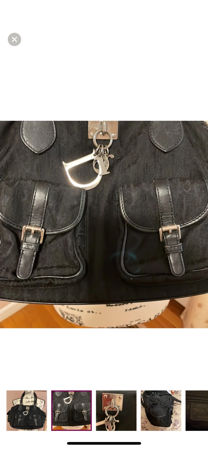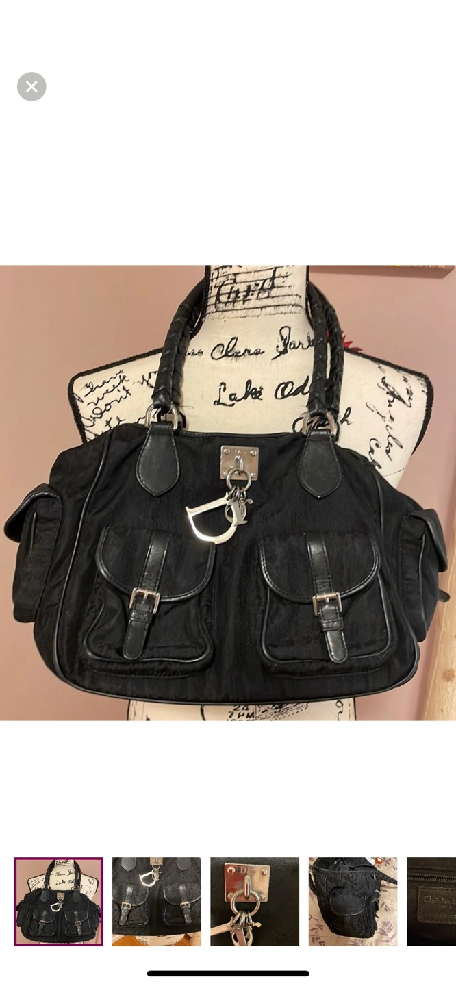 Black canvas tote bag with black leather accents and a silver Dior charm. The bag has multiple pockets and a top zipper closure. The handle is braided leather.