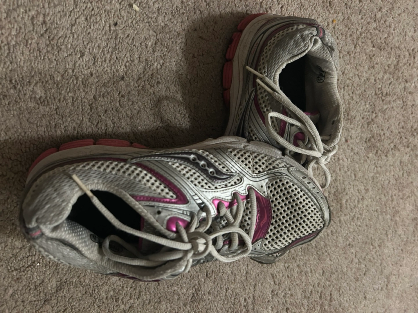 257Silver and pink running shoes with a mesh upper. They have a pink and white sole.
