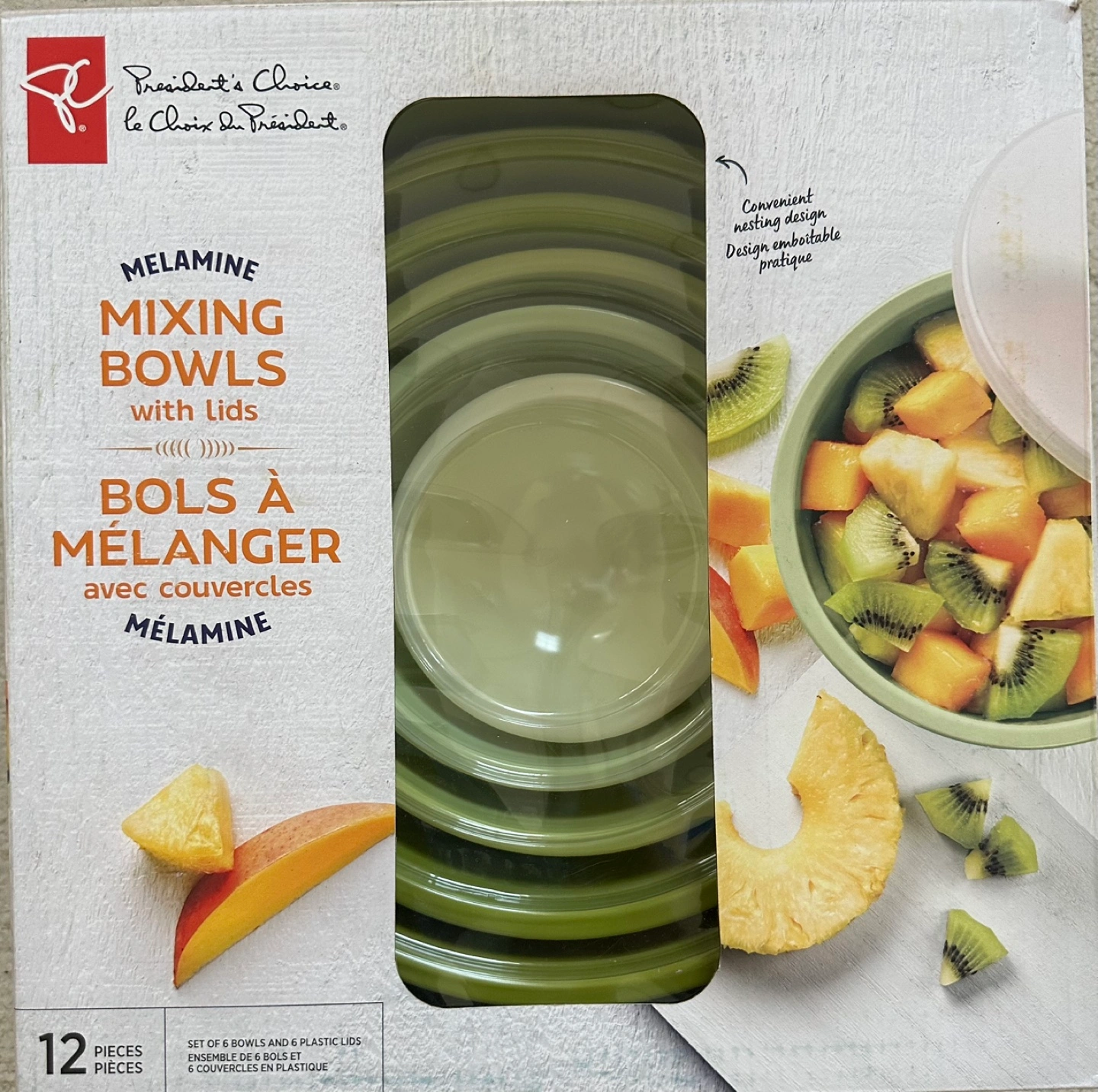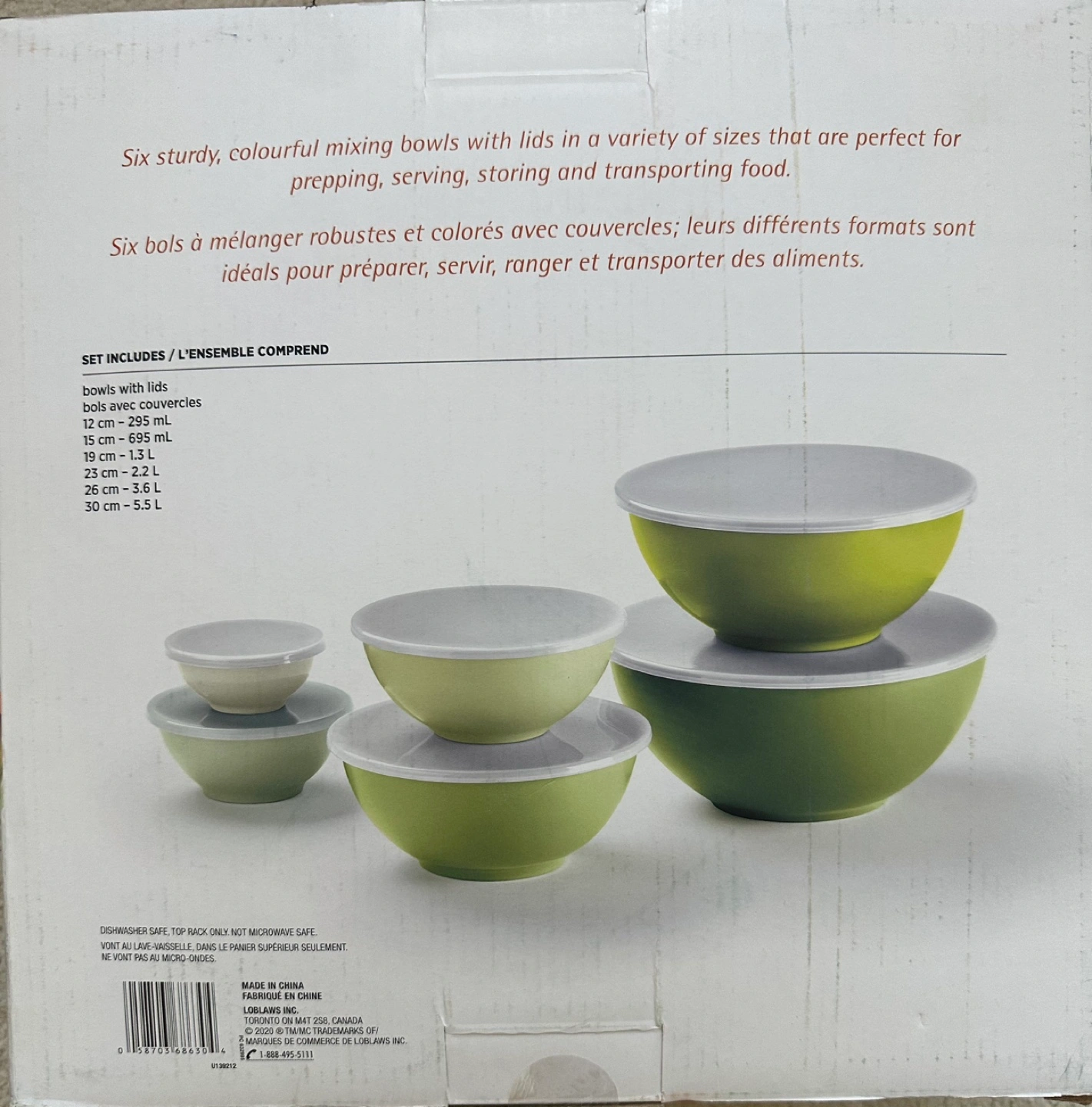 Six sturdy, colourful mixing bowls with lids in a variety of sizes that are perfect for prepping, serving, storing and transporting food. Set includes: 12 cm - 295 mL, 15 cm - 1.3 L, 22 cm - 2.2 L, 26 cm - 3.6 L, 30 cm - 5.1 L