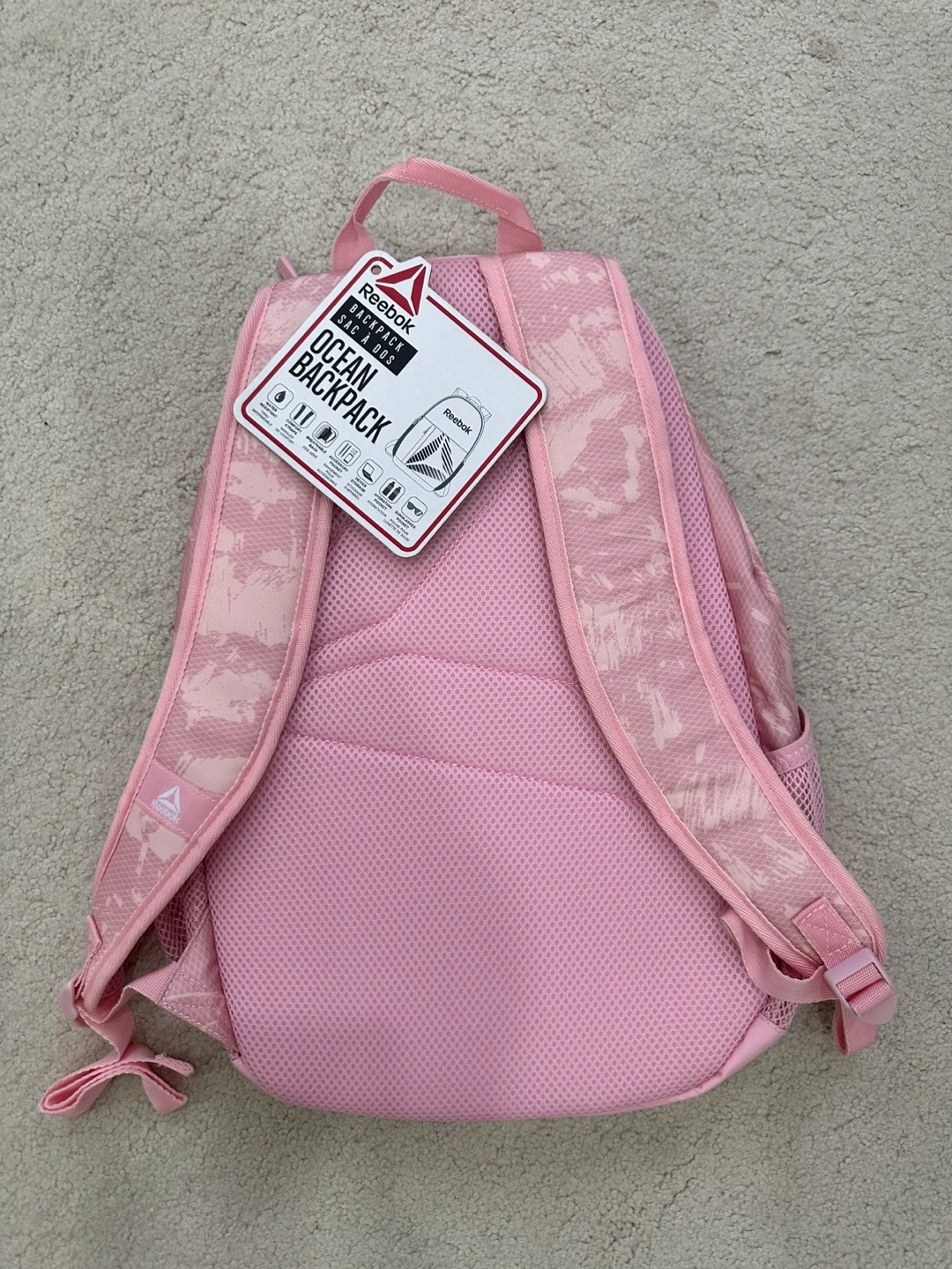 Pink backpack with a large front pocket and a smaller mesh pocket on each side. It has a padded back and adjustable shoulder straps.