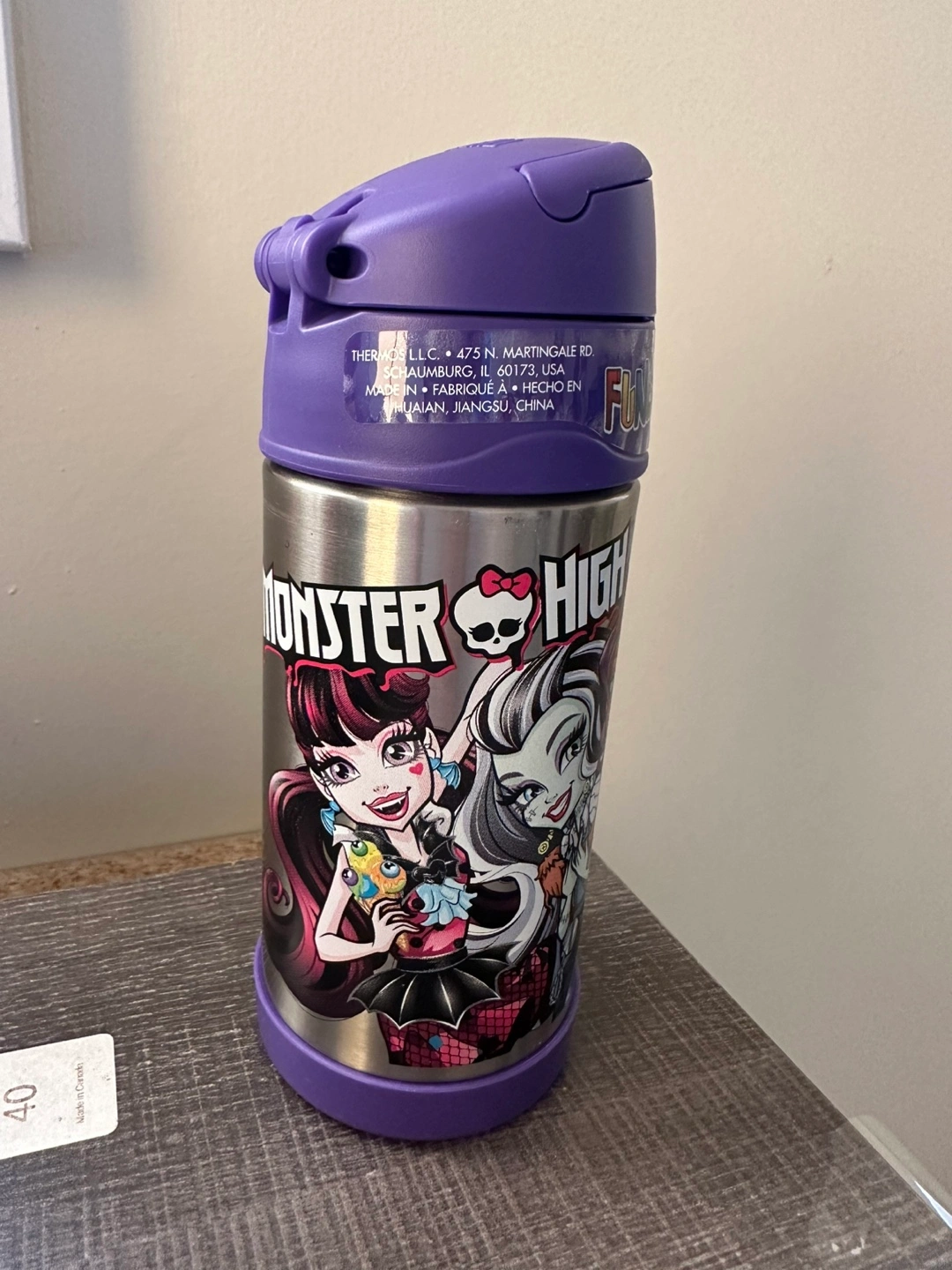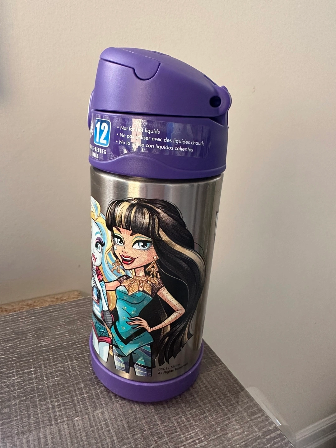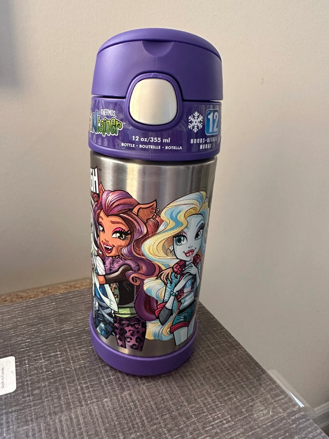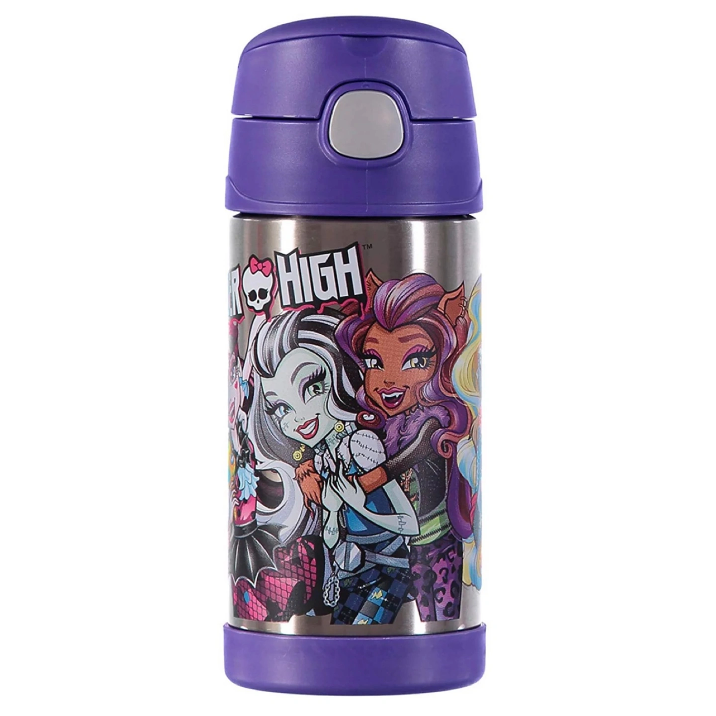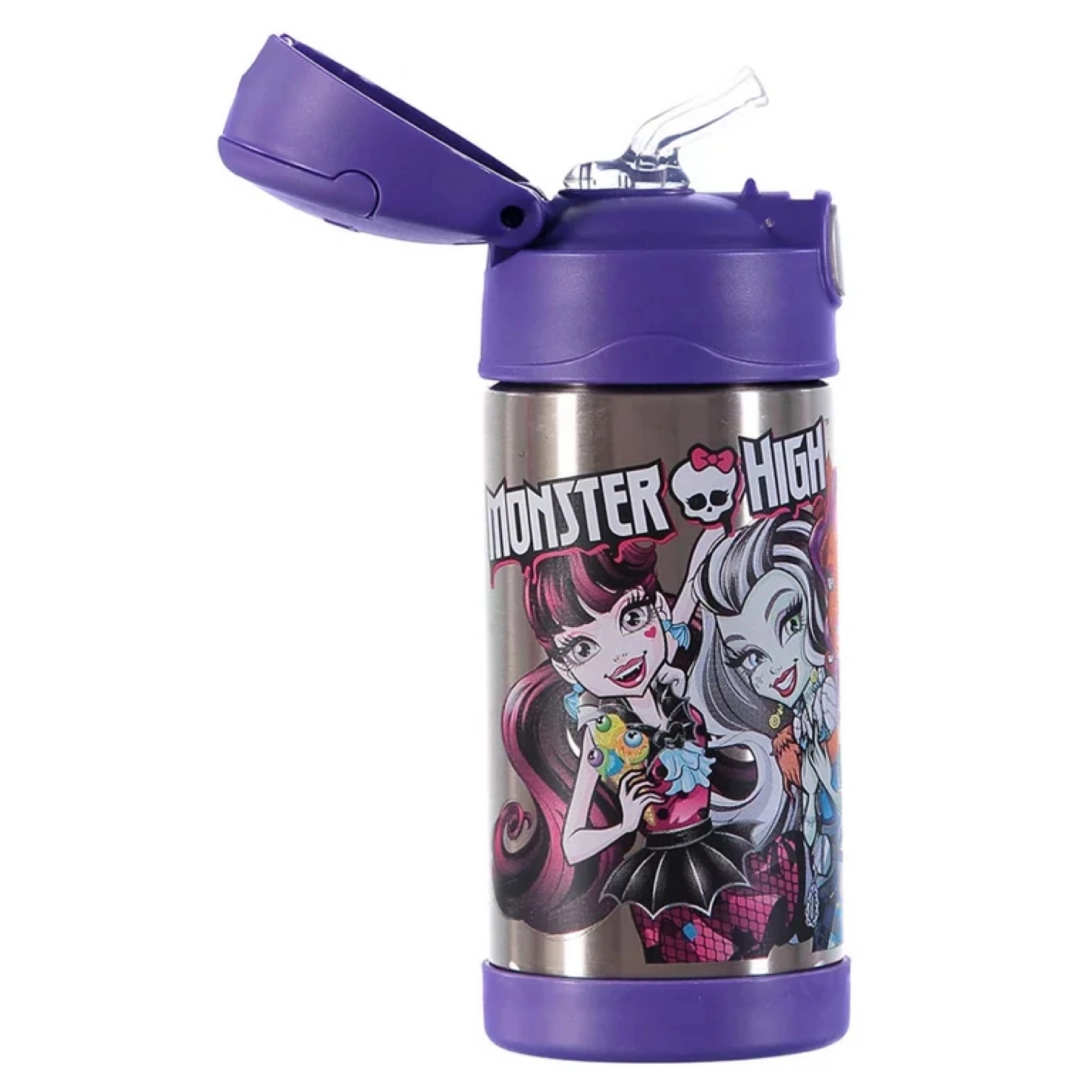 Stainless steel water bottle with straw lid. Features Monster High characters.