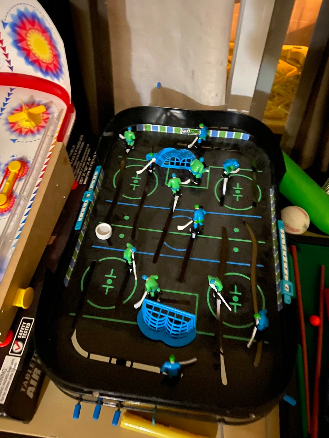 Vguc one of the blue end bits on the sliders that moves players has come off the end but we just put some tape to replace it doesn't affect function . FYI potentially if bigger kids try to play super rough like how they do in arcade version then the plastic guys or net might pop off ... they are easy to pop back in but is perfect for beginners who are more interested in going a bit slowly/softly as they learn which players are controlled by which slider etc