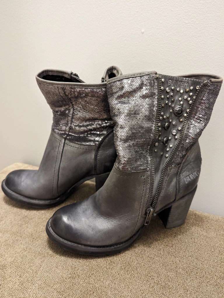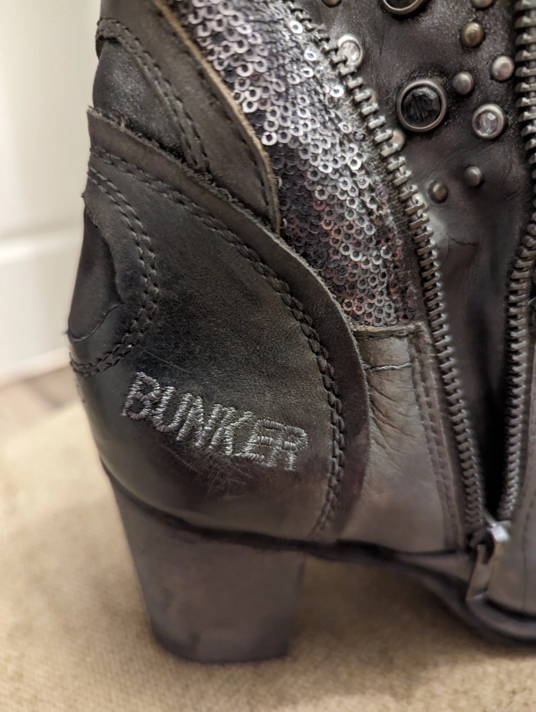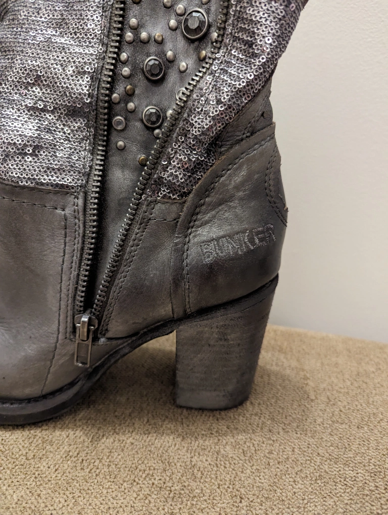Black leather boots with silver sequins and studs. Side zipper and chunky heel. Worn but in great condition.