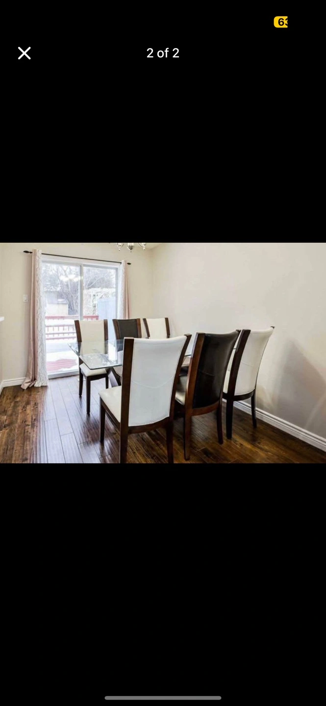 Glass top dining table with six chairs. Table has a glass top and a wooden base. Chairs are upholstered with white fabric and have a brown wooden frame.