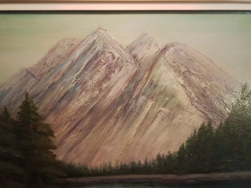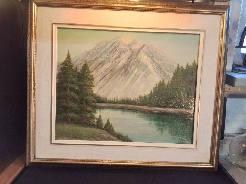Framed painting of mountains, trees, and a lake. Signed by artist, Alice Lindsay