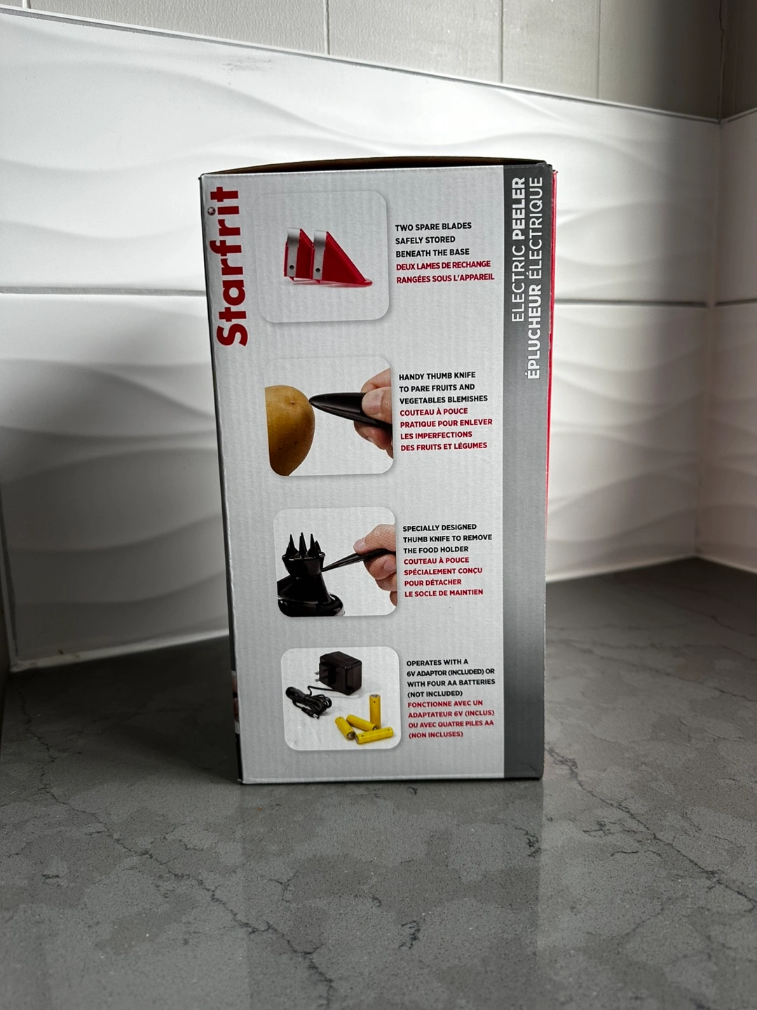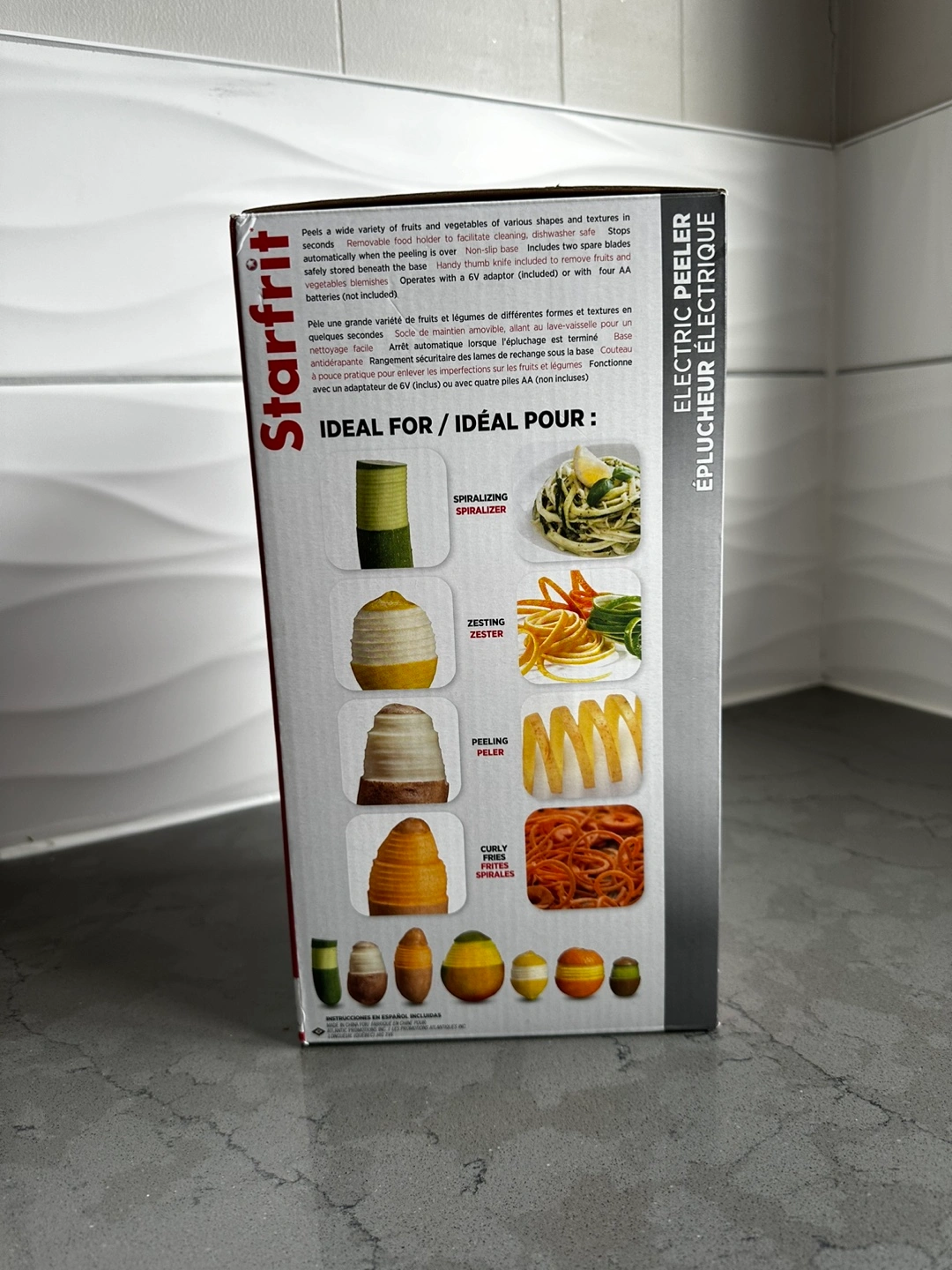 It safely peels potatoes, cucumbers, apples, pears, peaches, turnips, onions, tomatoes, radishes, kiwis and more.