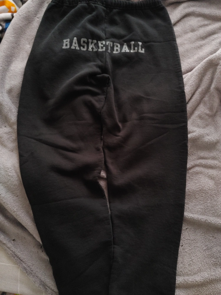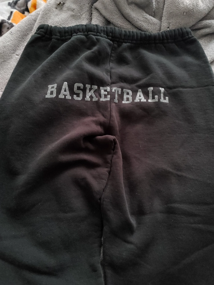 Black sweatpants with the word 'Basketball' on the back. Size 8.