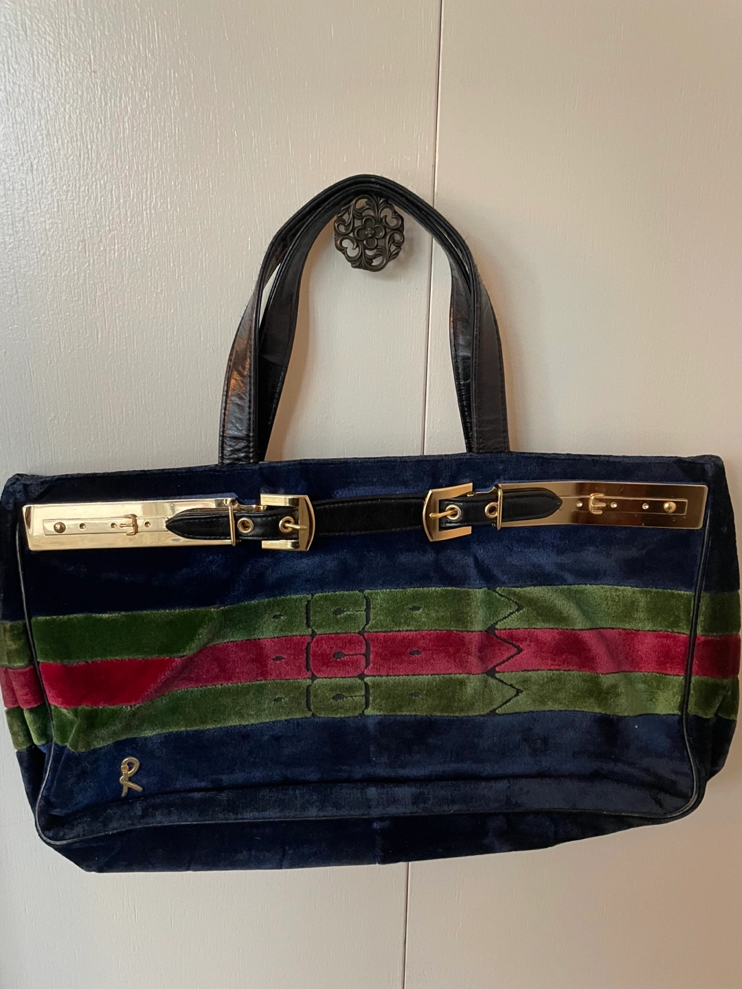 Blue velvet handbag with green and red stripes. Gold buckles with black leather accents.