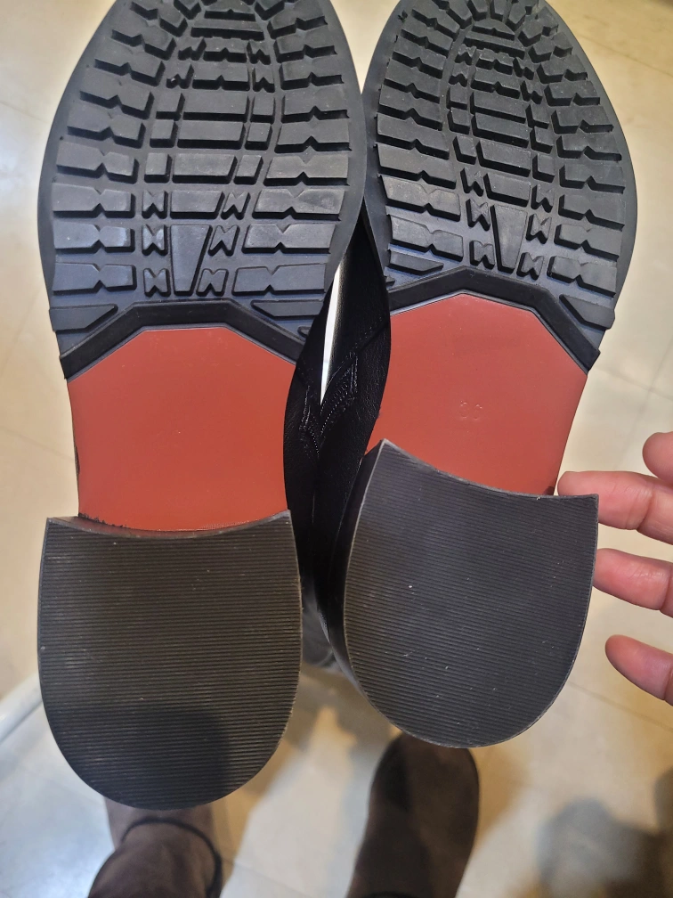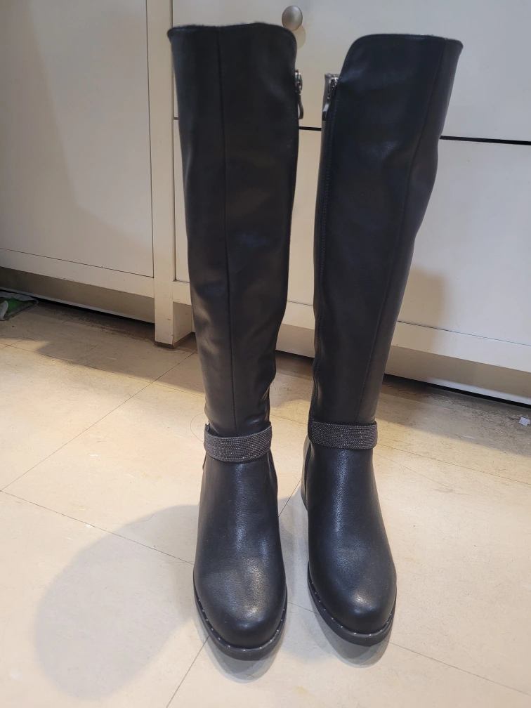 88Black knee-high boots with a side zipper and embellished strap. made in Spain