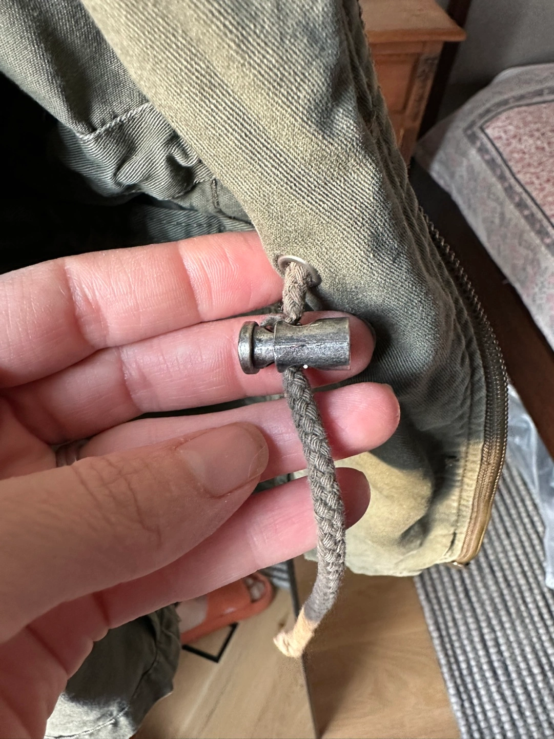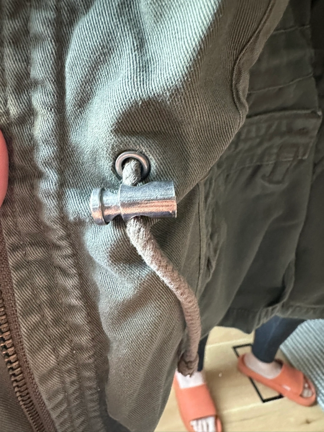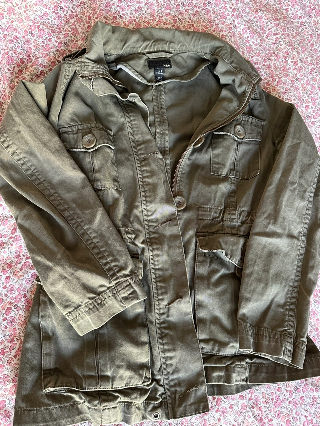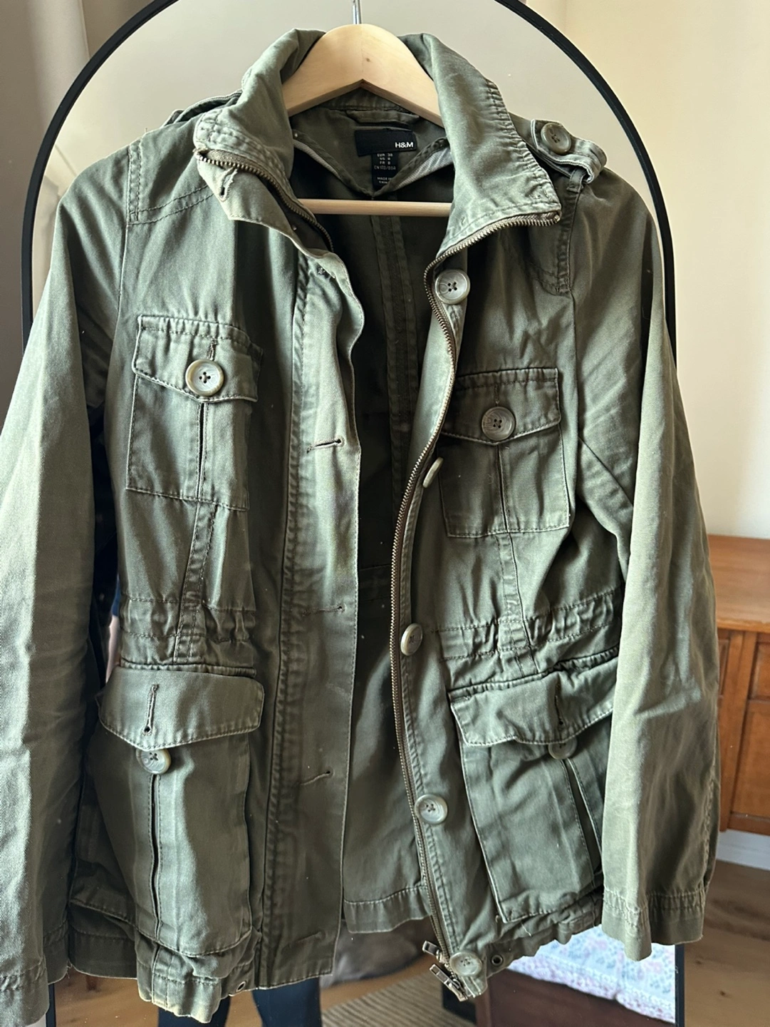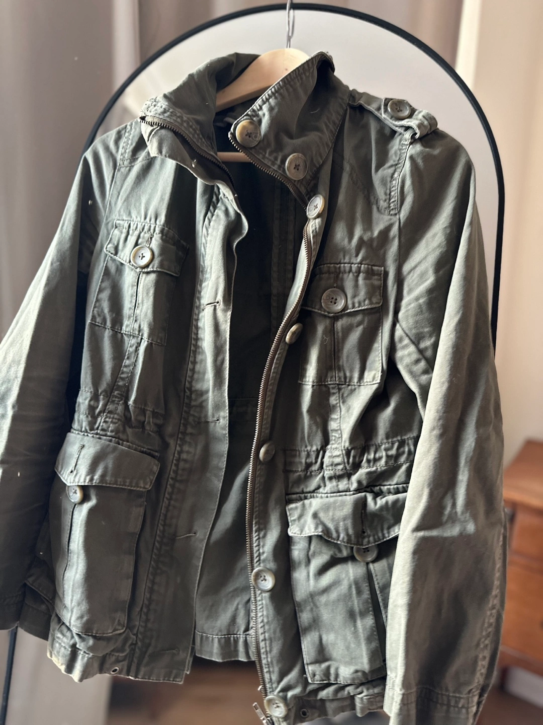 1000+Green utility jacket with multiple pockets and a drawstring waist. Zipper and button closure. Long sleeves with buttoned cuffs. CASH ONLY please and thank you.