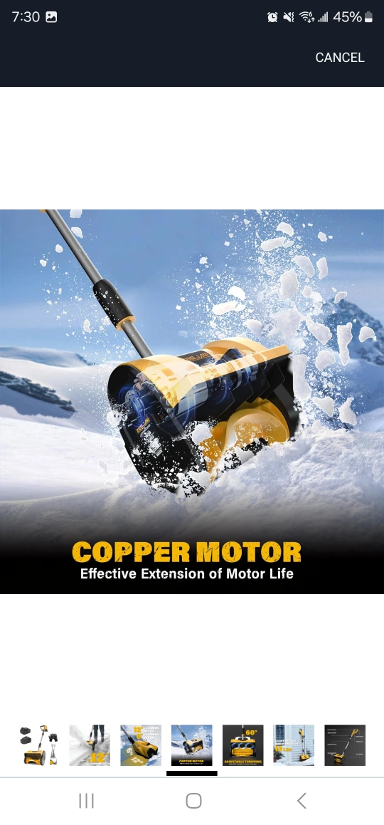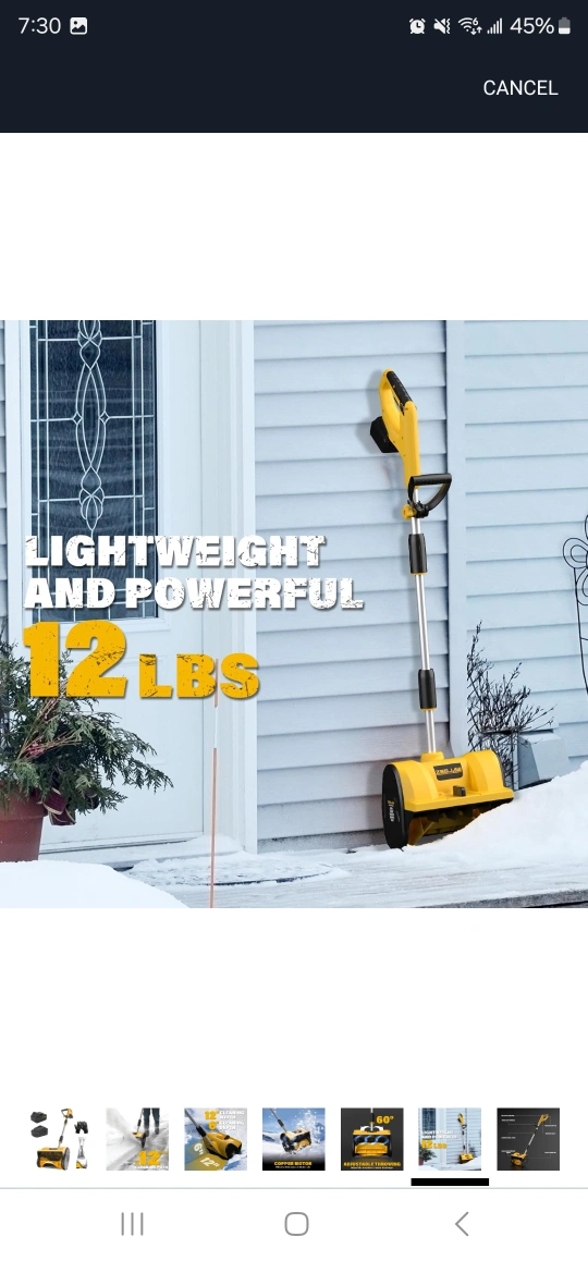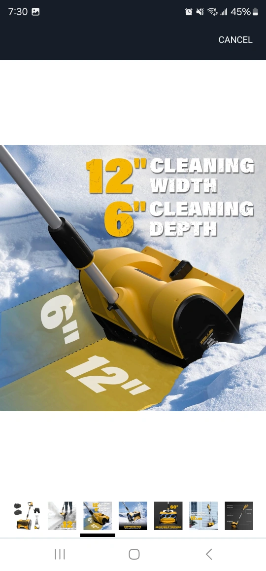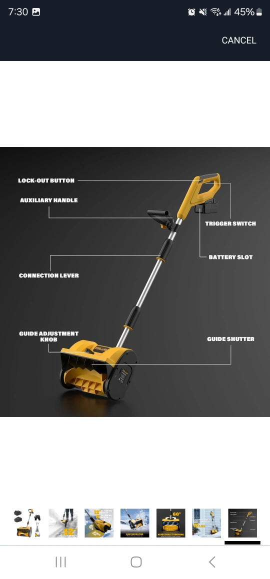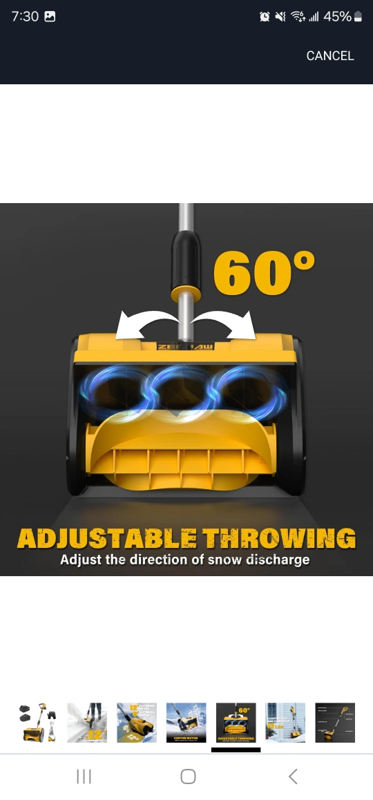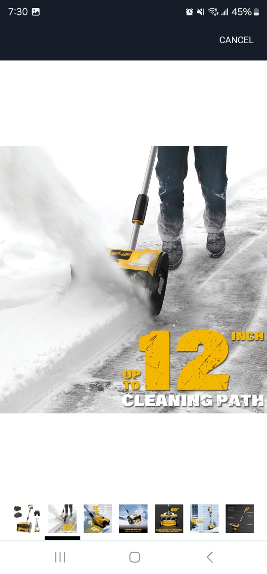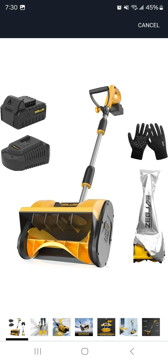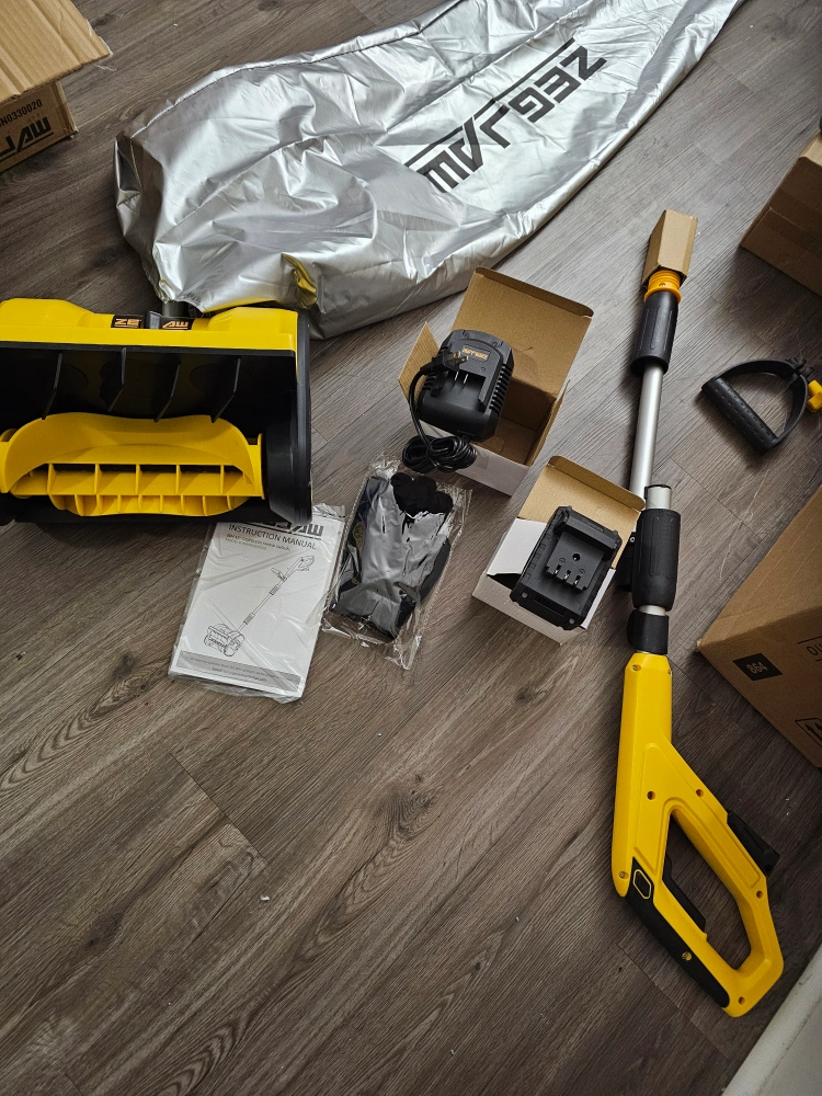 Cordless snow shovel, 20V, 12-inch cleaning path, includes battery and charger. Adjustable throwing direction.