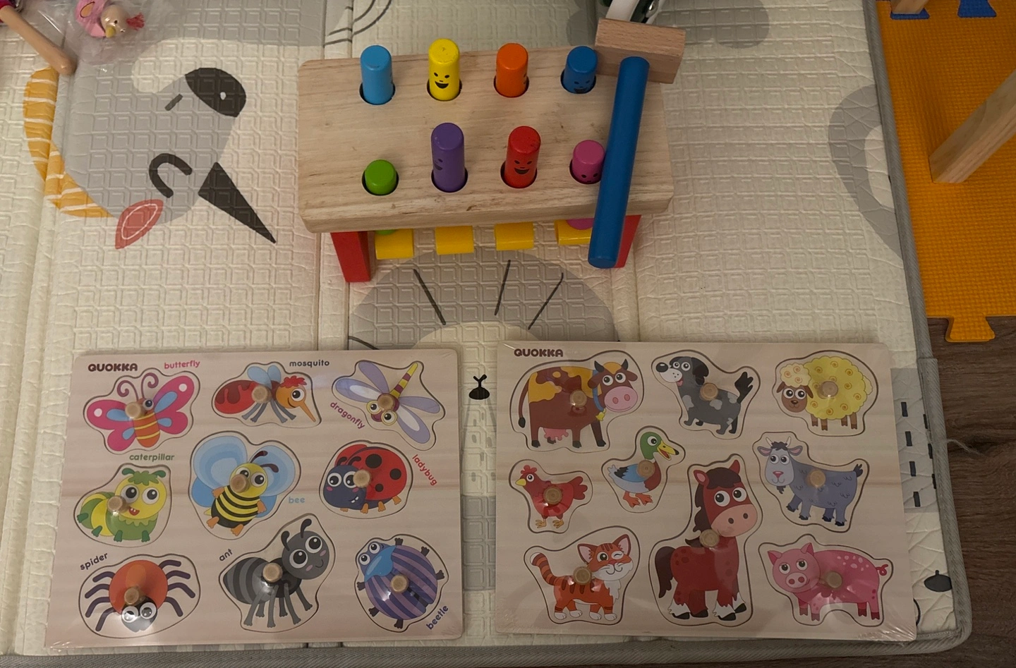 Includes a Melissa And Doug hammering toy and two animal puzzles (sealed/brand new). One puzzle has farm animals and the other has insects.