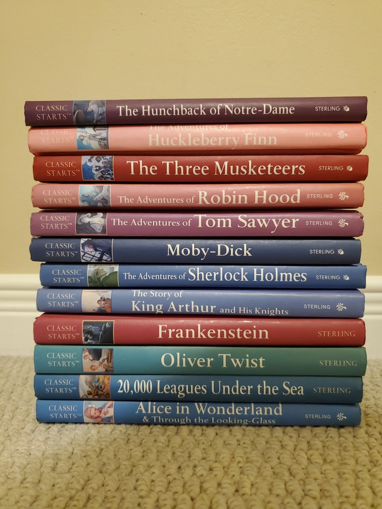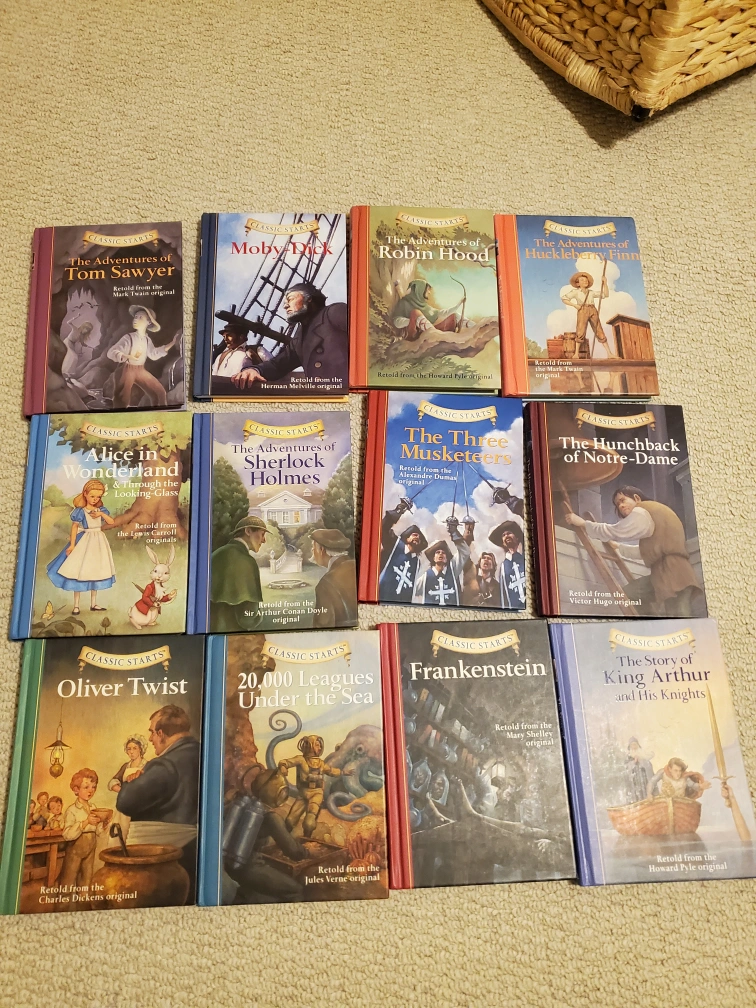 Set of 12 Classic Starts books. Retold from the original novels. Titles include: Alice in Wonderland, The Adventures of Sherlock Holmes, Moby Dick, The Adventures of Robin Hood, The Adventures of Tom Sawyer, The Three Musketeers, The Hunchback of Notre Dame, The Adventures of Huckleberry Finn, Oliver Twist, 20,000 Leagues Under the Sea, Frankenstein, The Story of King Arthur and His Knights.
