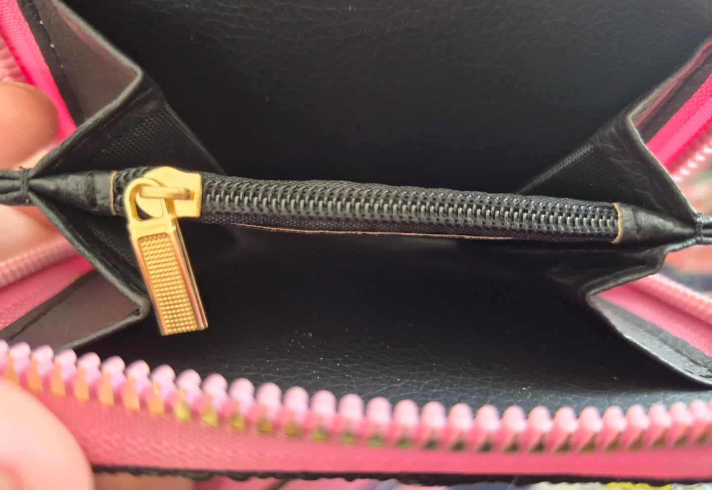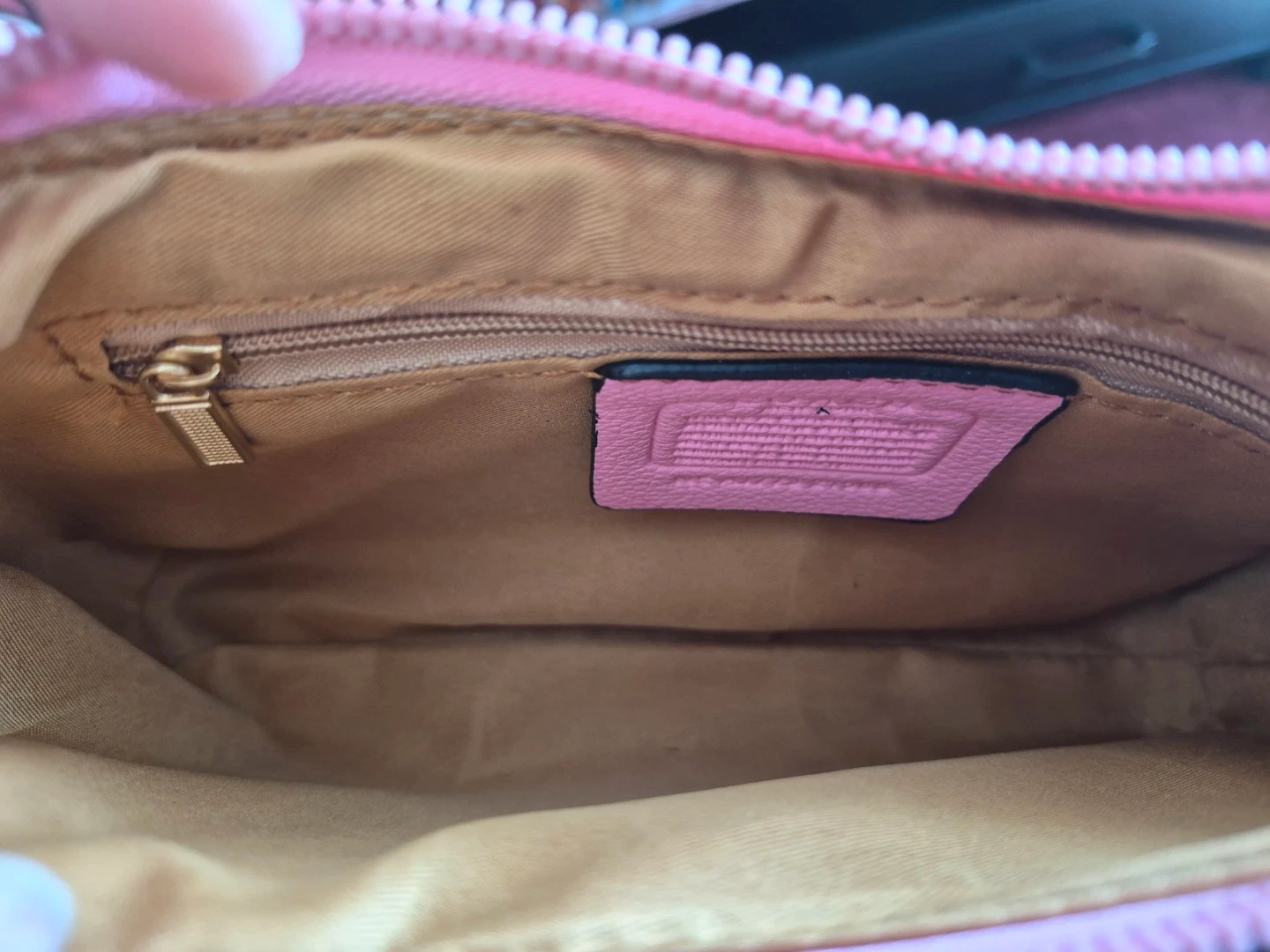 This is a chic Coach pink shoulder bag featuring the signature monogram pattern. It comes with a matching cardholder and a small coin purse. The bag has a zip closure for security. It's made from faux leather.