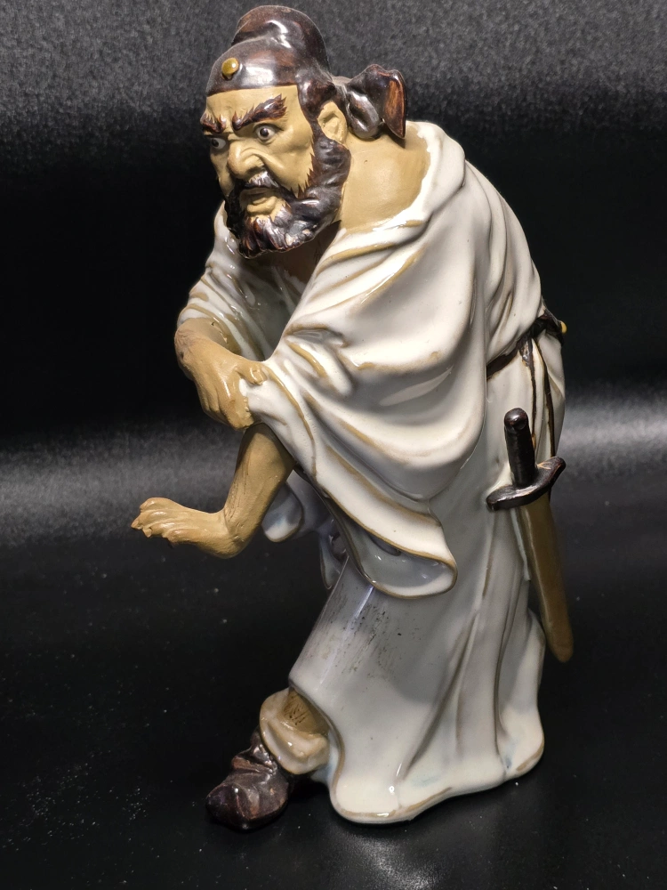 Ceramic figurine of a man with a beard and a sword. It is in excellwnt condition and has no cracks or chips. 8" tall. this is a rare find.