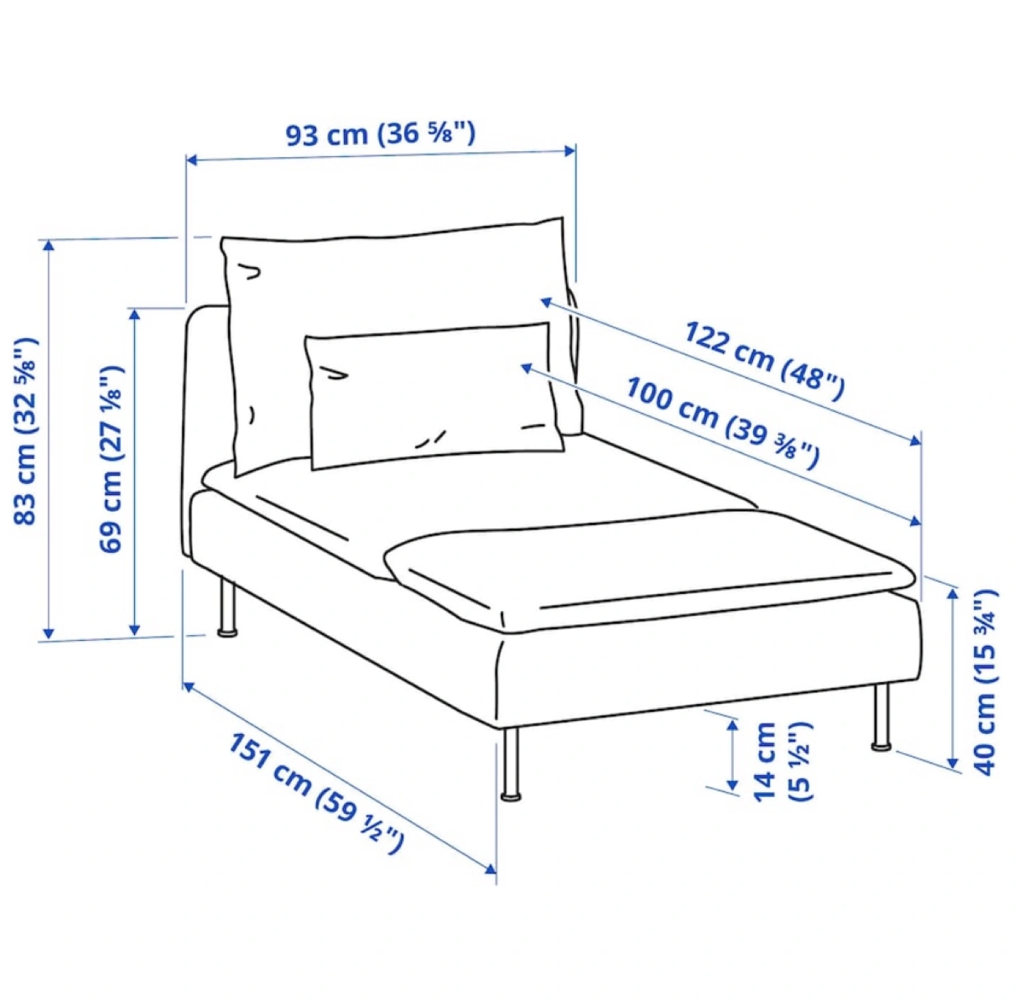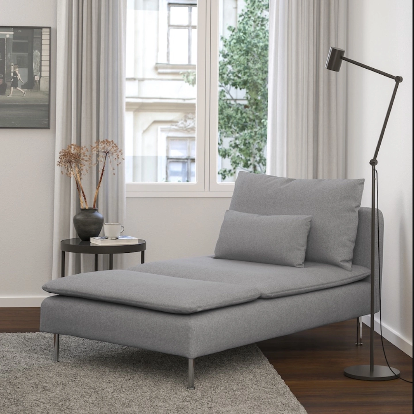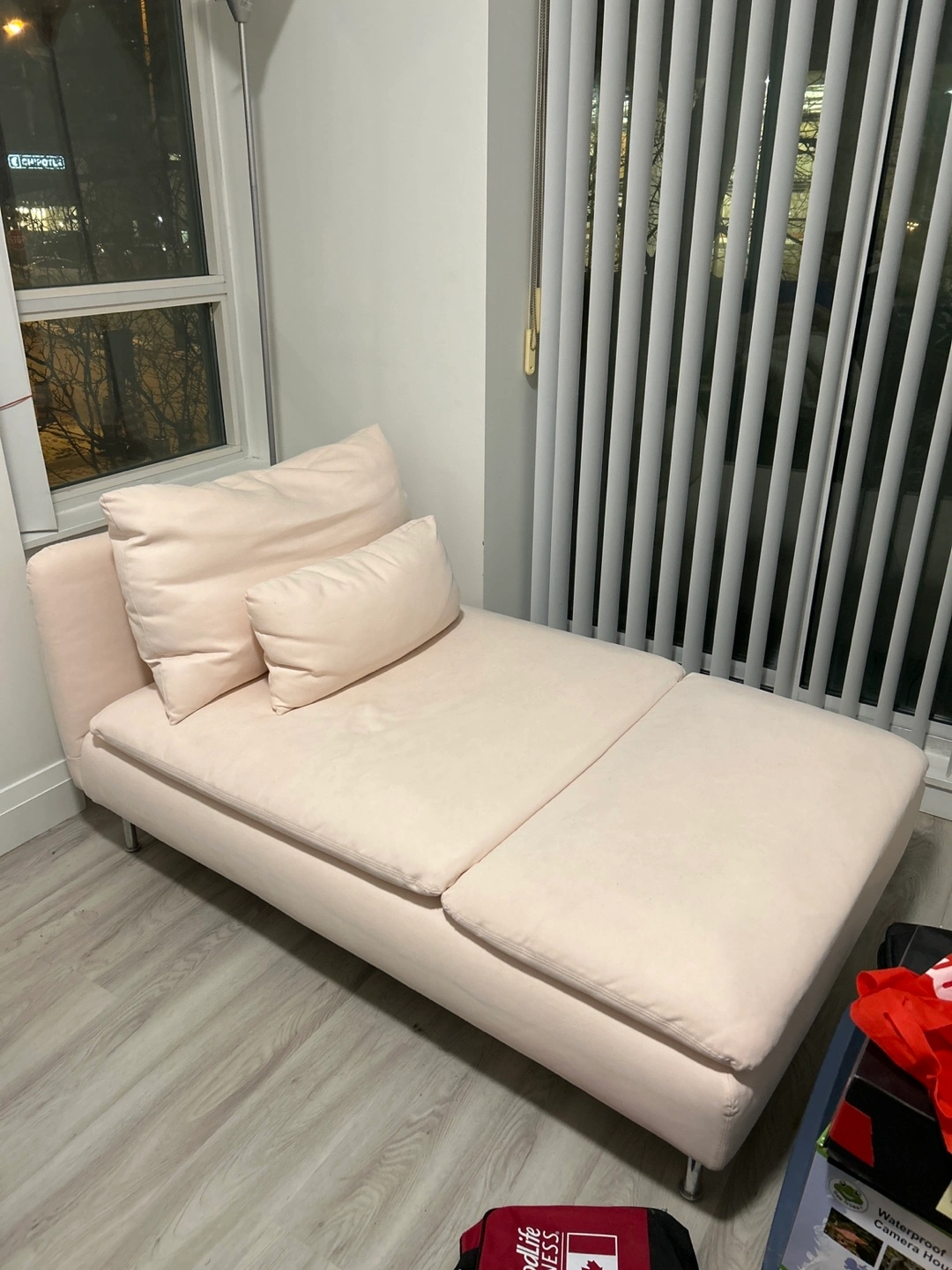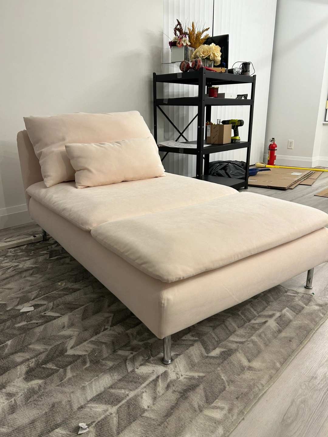 Chaise lounge with silver legs. In good condition. We kept it covered with blankets and the covers are removable and washable. Comes with two throw pillows. It’s light pink, you can buy and replace cushion colour or add more soderhamn modular pieces.