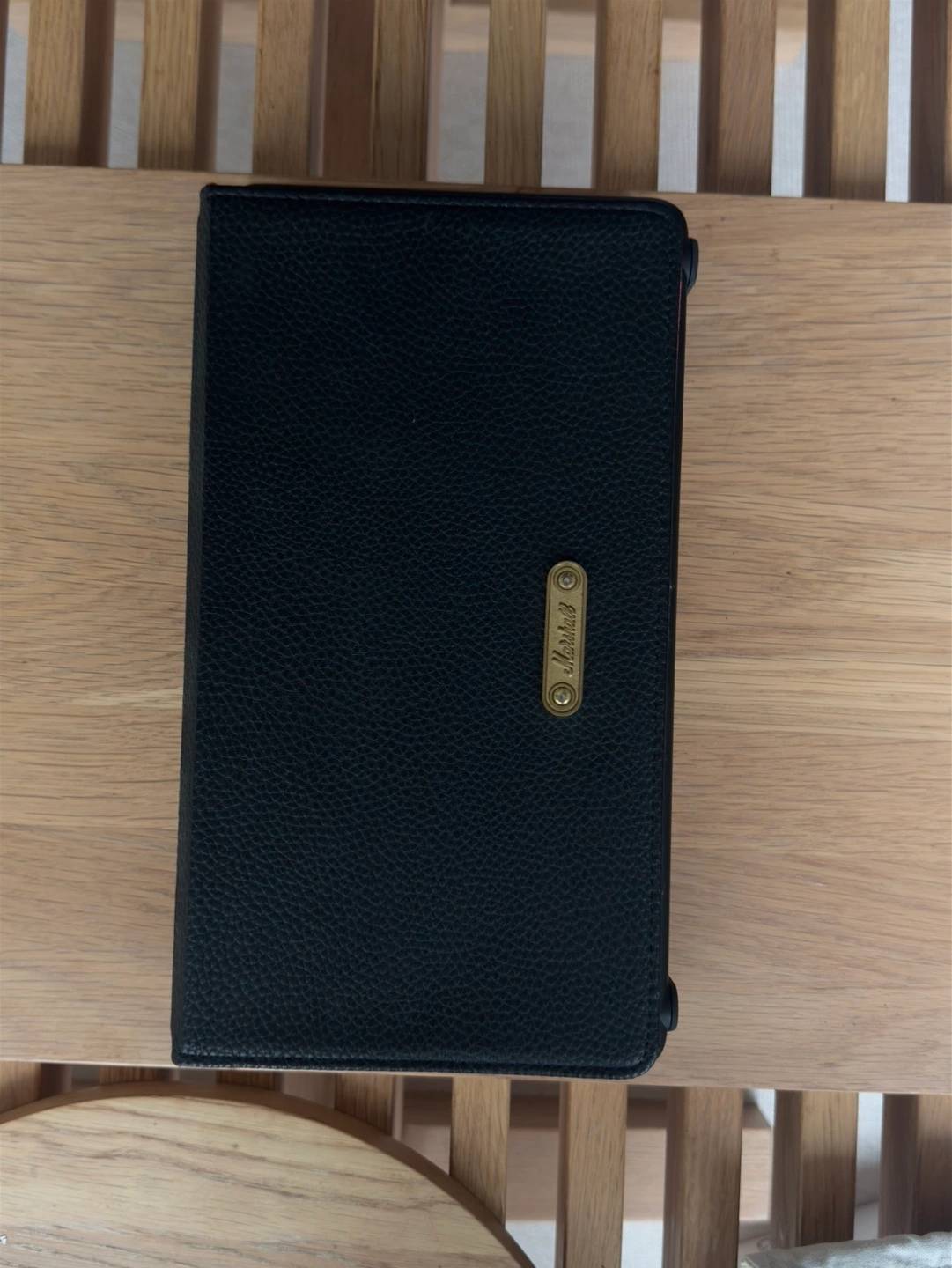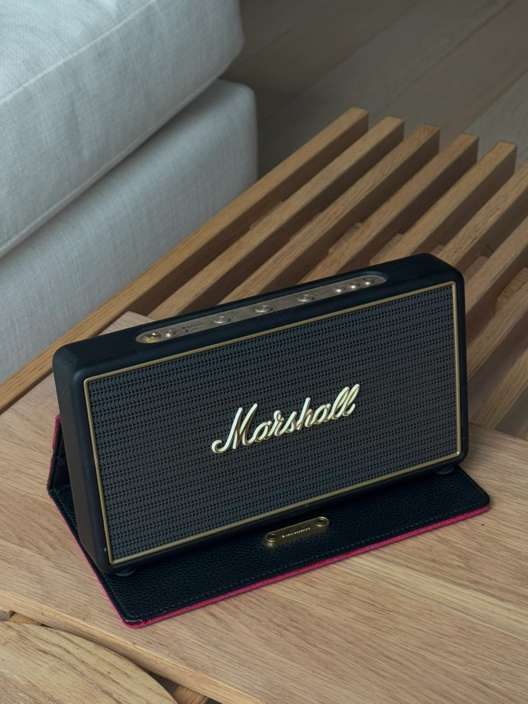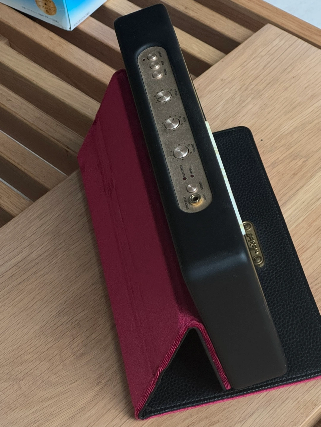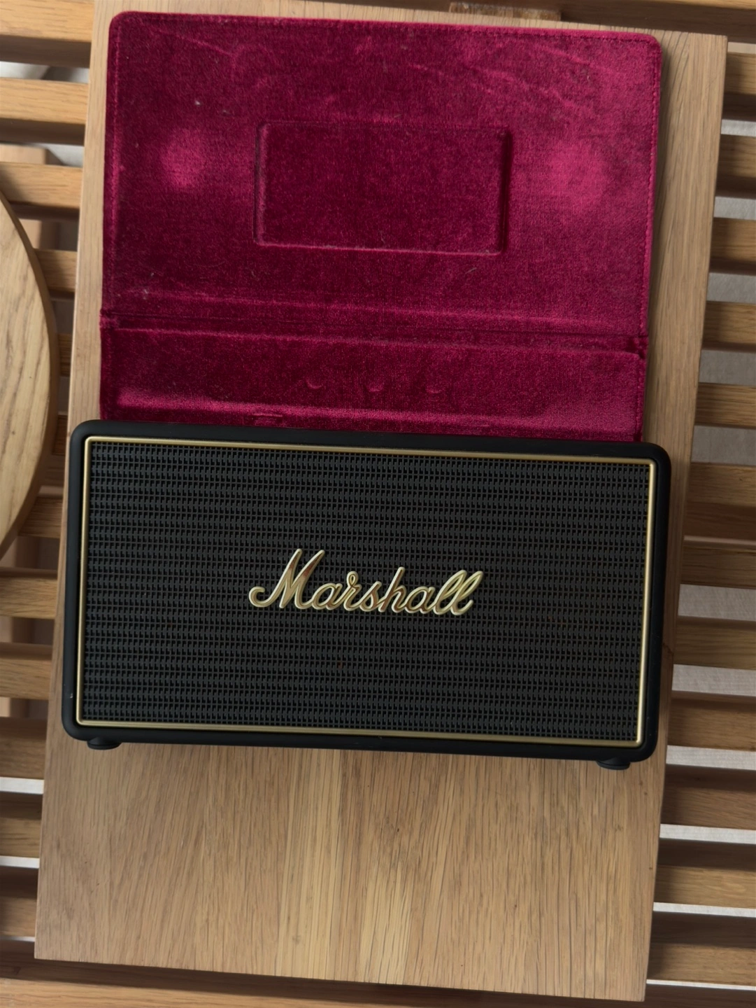 34Black portable Bluetooth speaker with a red interior case. Includes aux cord. Has buttons for volume, bass, treble, and power. Model: Marshall Stockwell. Condition: Very Good