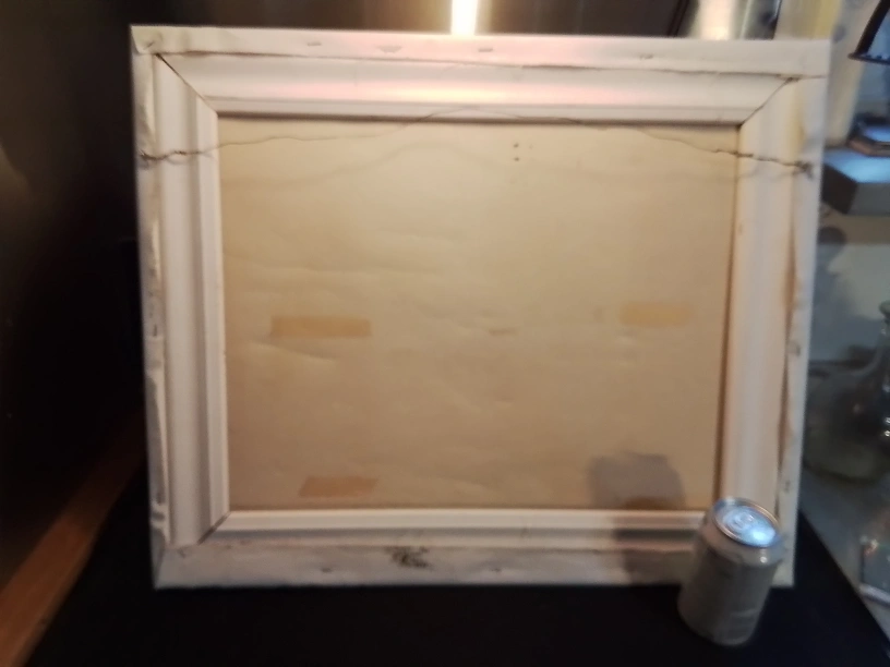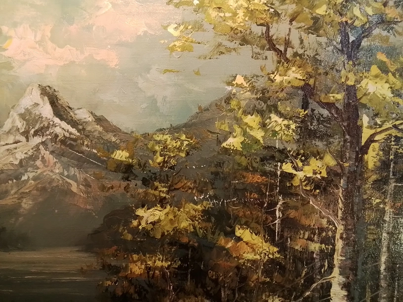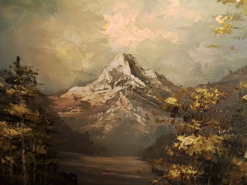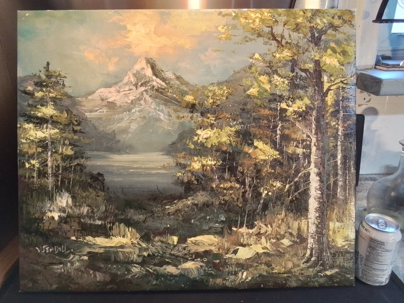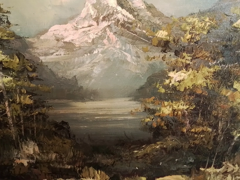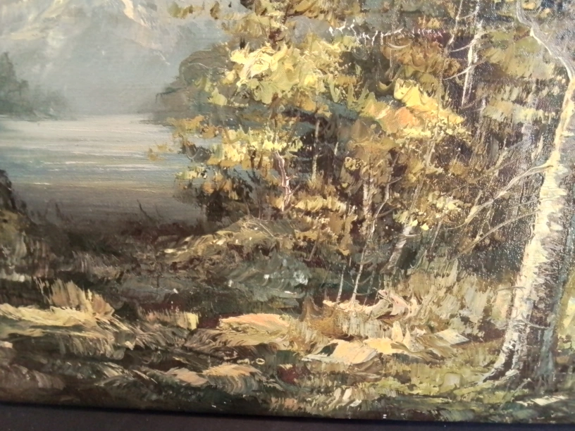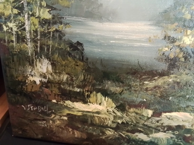 Original oil painting on canvas. Depicts a mountain scene with a lake in the foreground. Signed "Wendell".