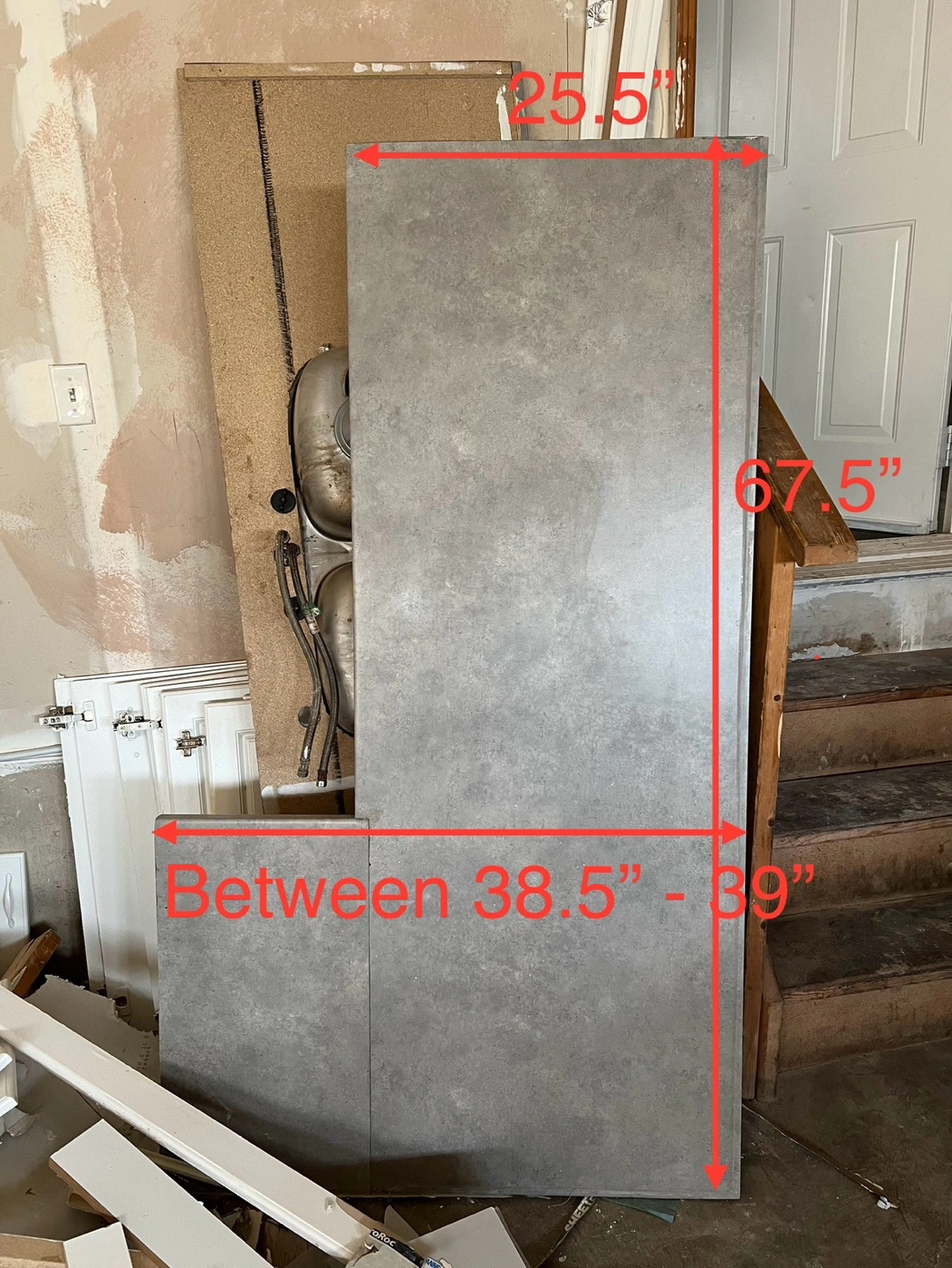 Laminate countertop with double sink available for sale. It’s in very good condition. Already removed from the kitchen. See dimensions in picture to get the idea.