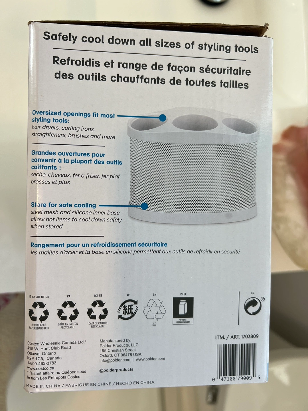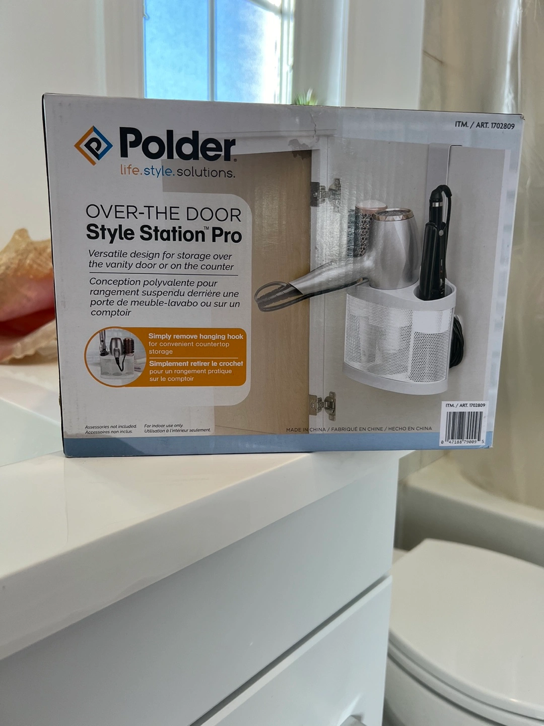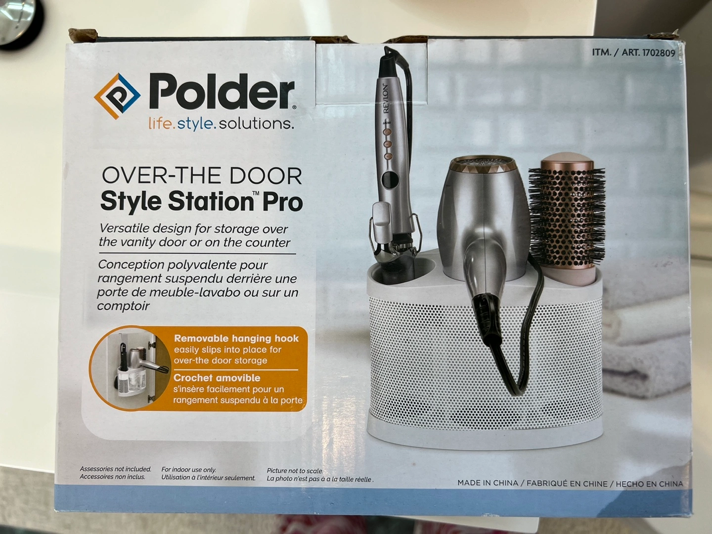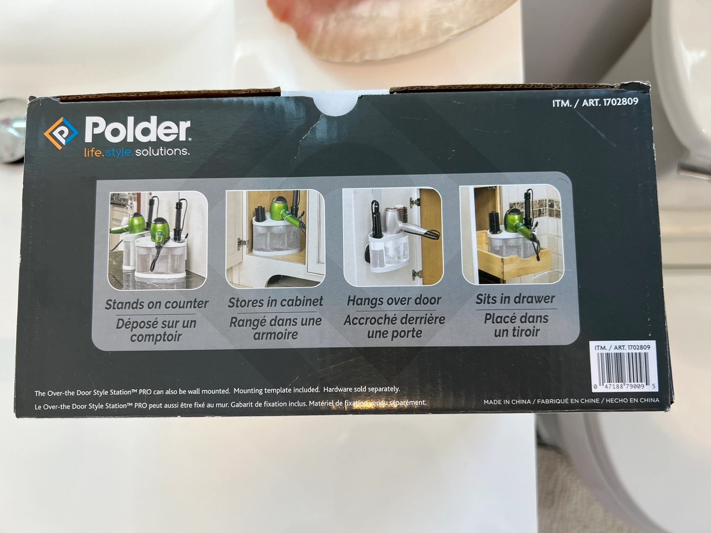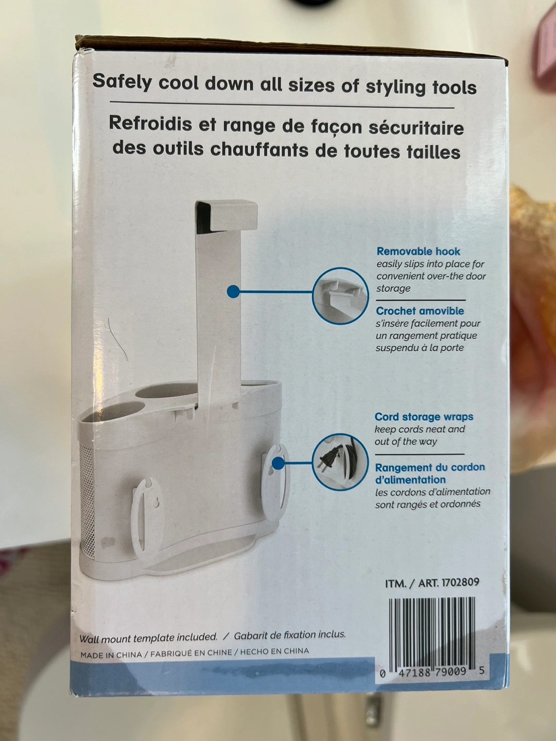 Versatile design for storage over the vanity door or on the counter. Removable hanging hook easily slips into place for over-the-door storage. Cord storage wraps keep cords neat and out of the way.