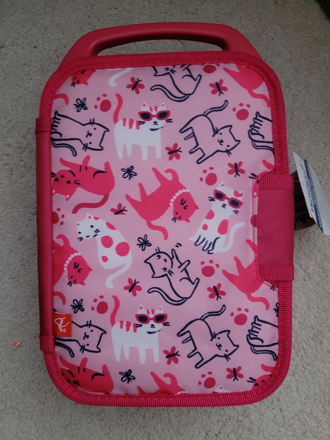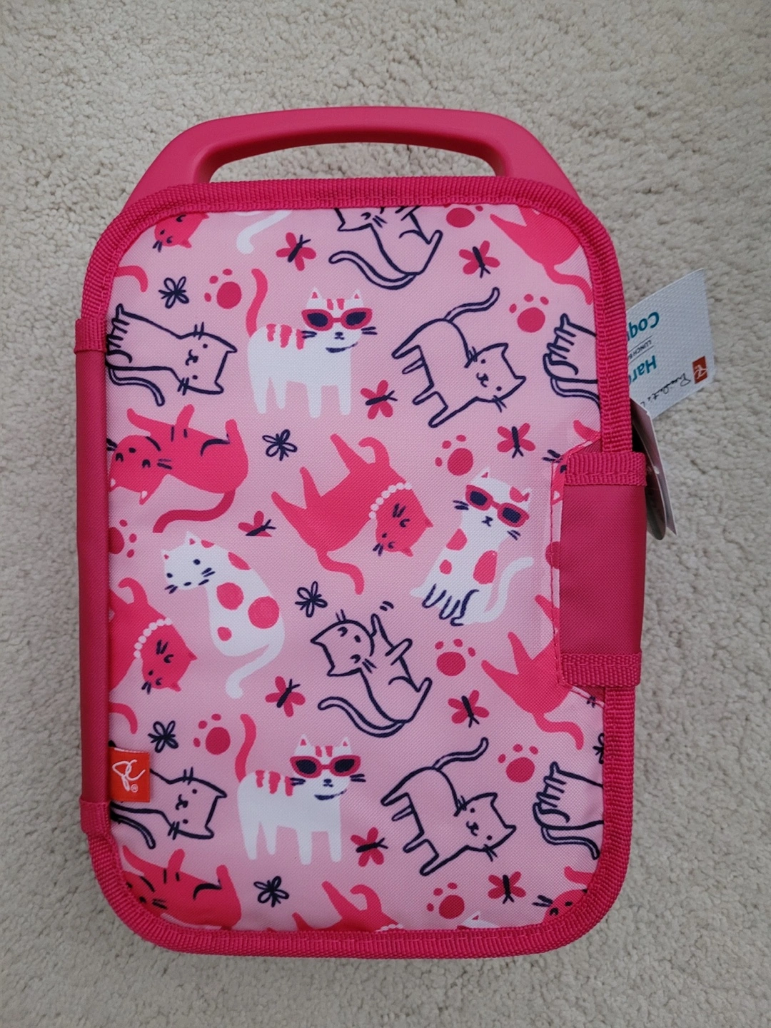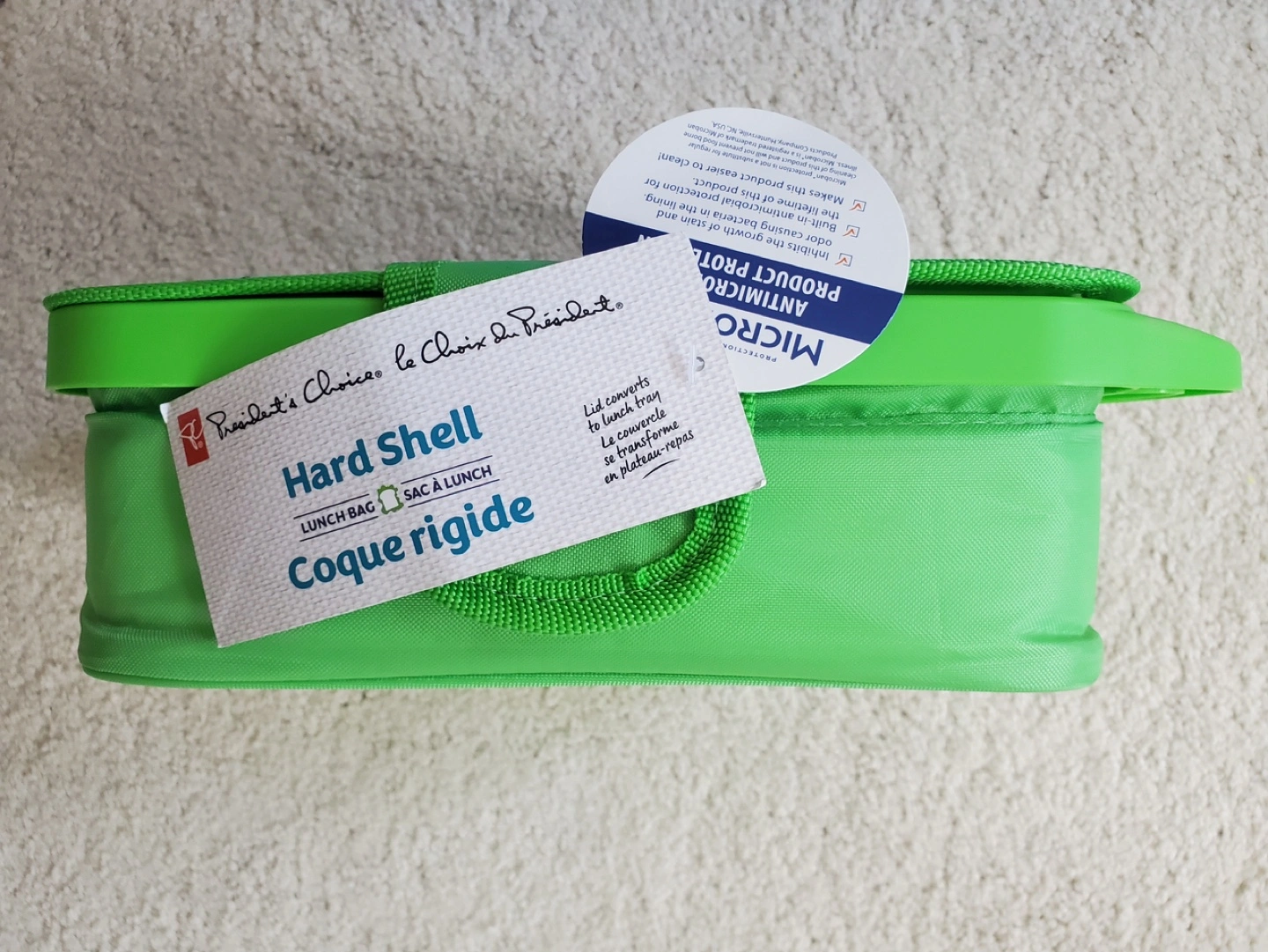 Lunch bag with hard plastic shell and soft fabric exterior. Features a handle and a strap for carrying. Contains an inner tray and an outer container.
