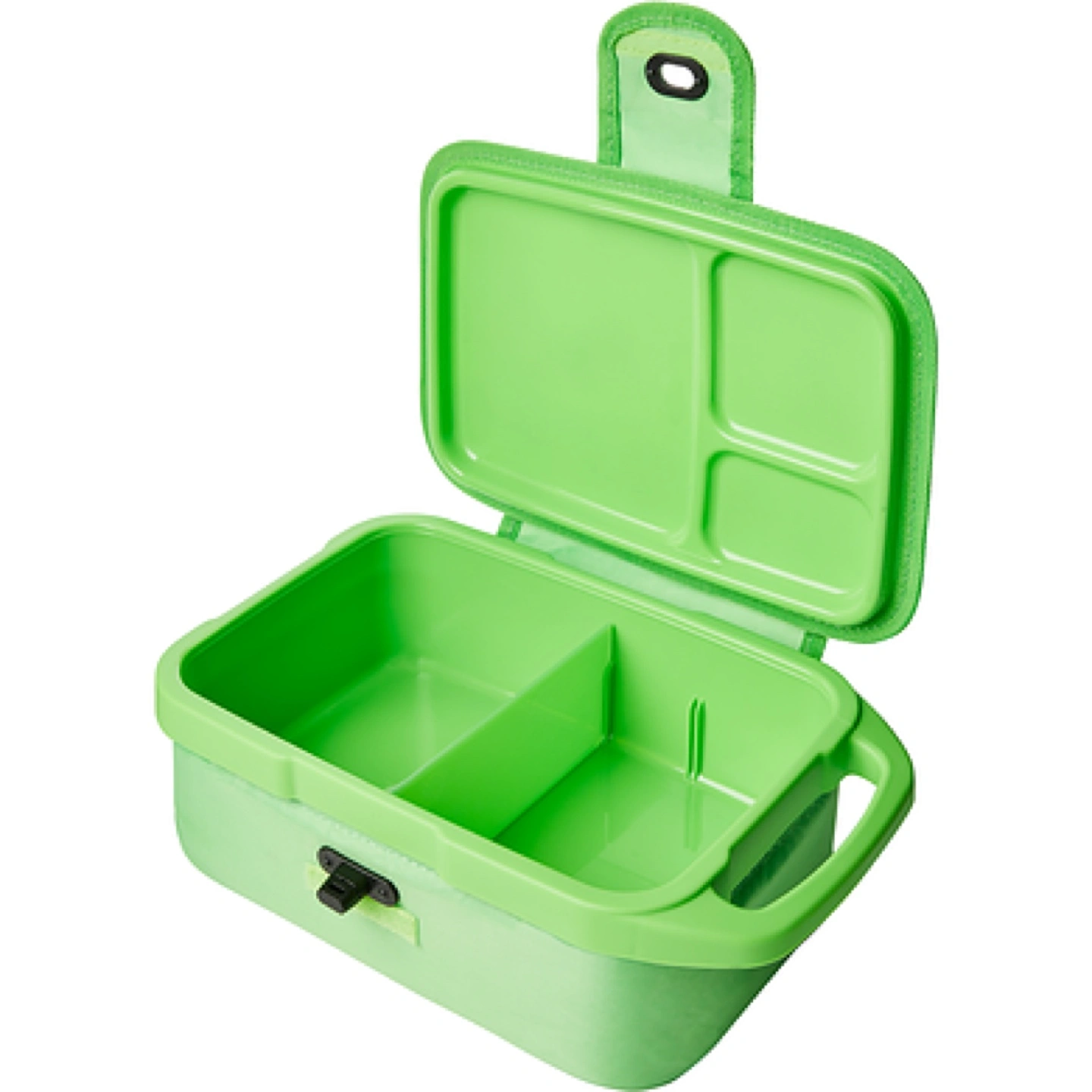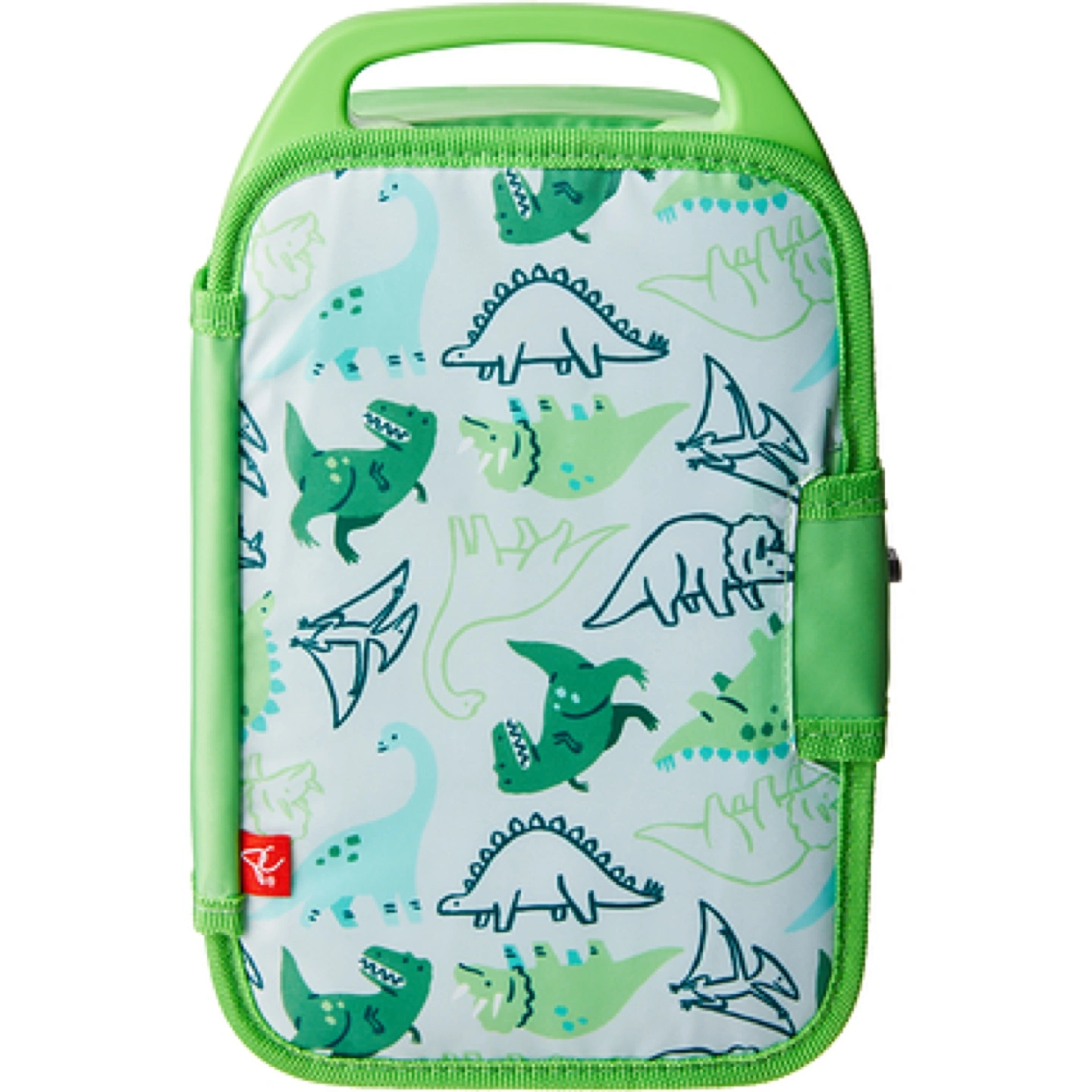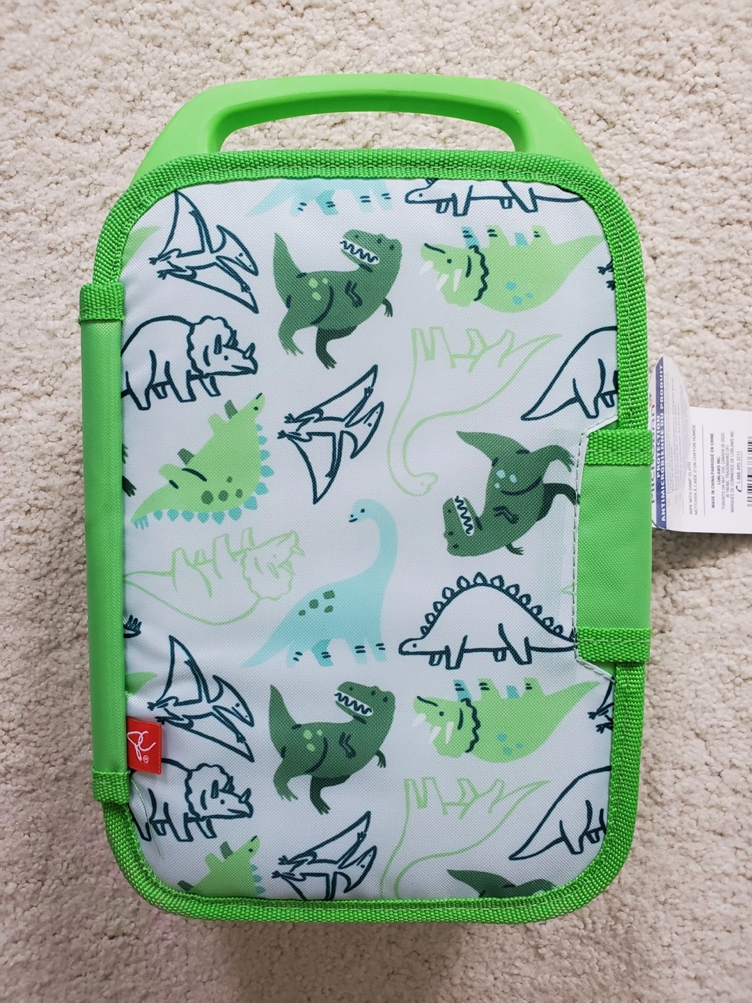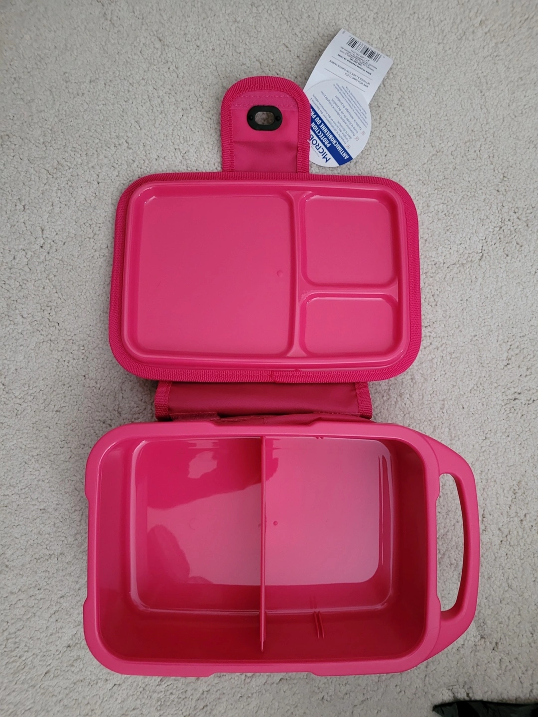 Lunch bag with hard plastic shell and soft fabric exterior. Features a handle and a strap for carrying. Contains an inner tray and an outer container.