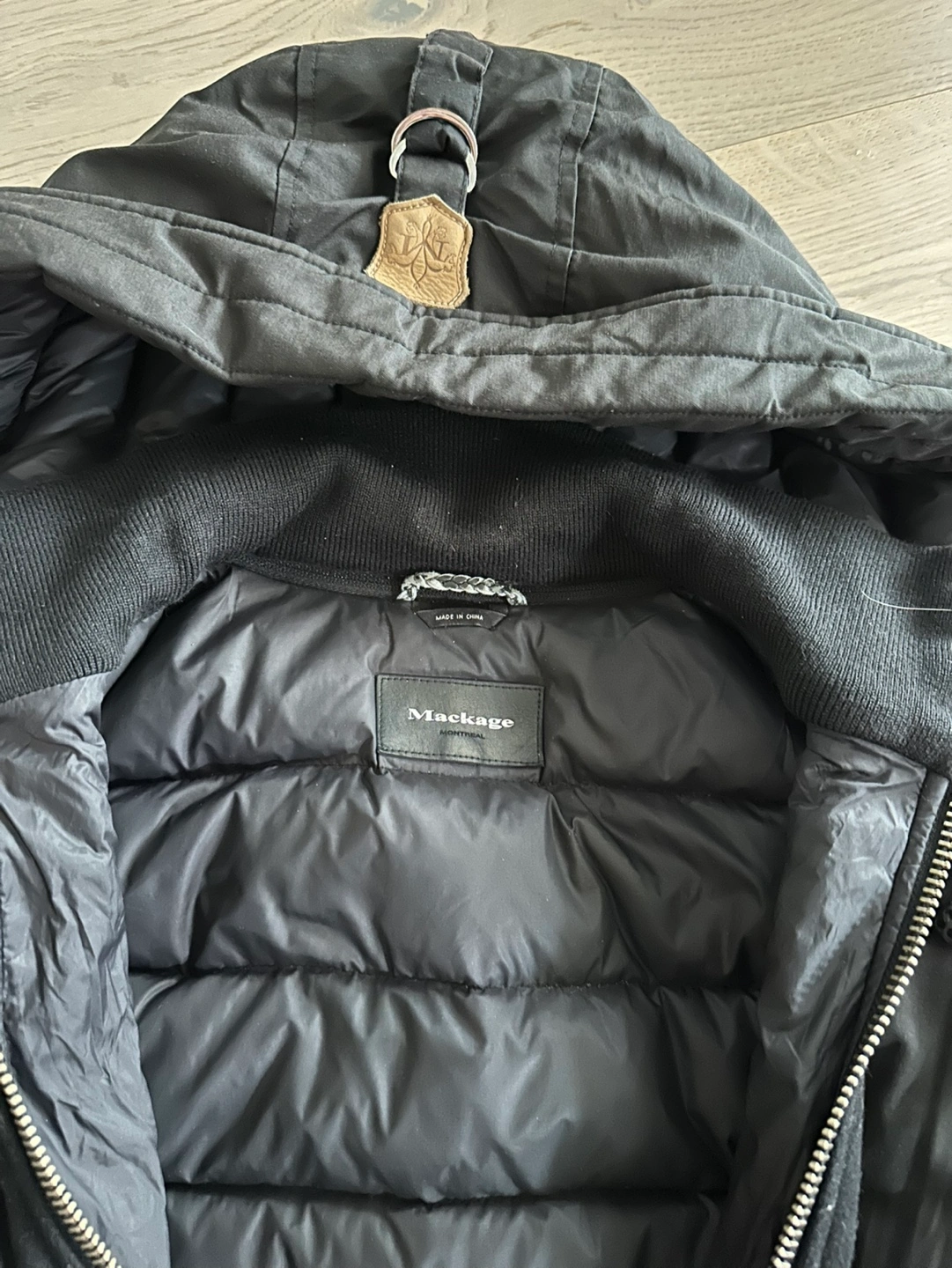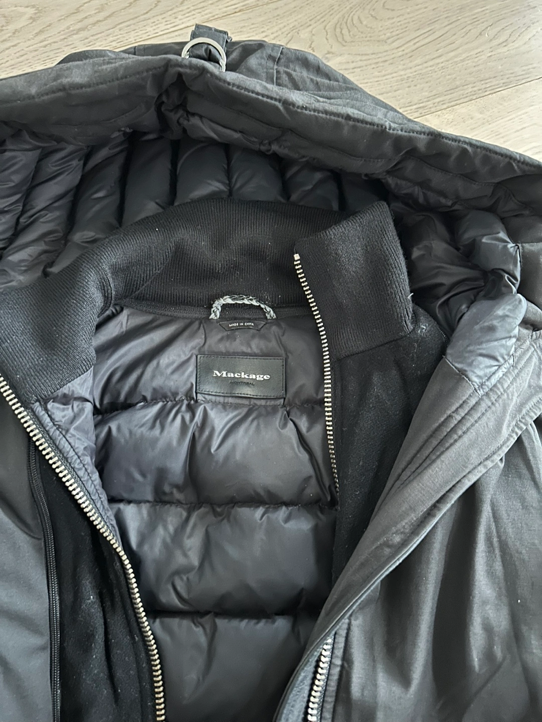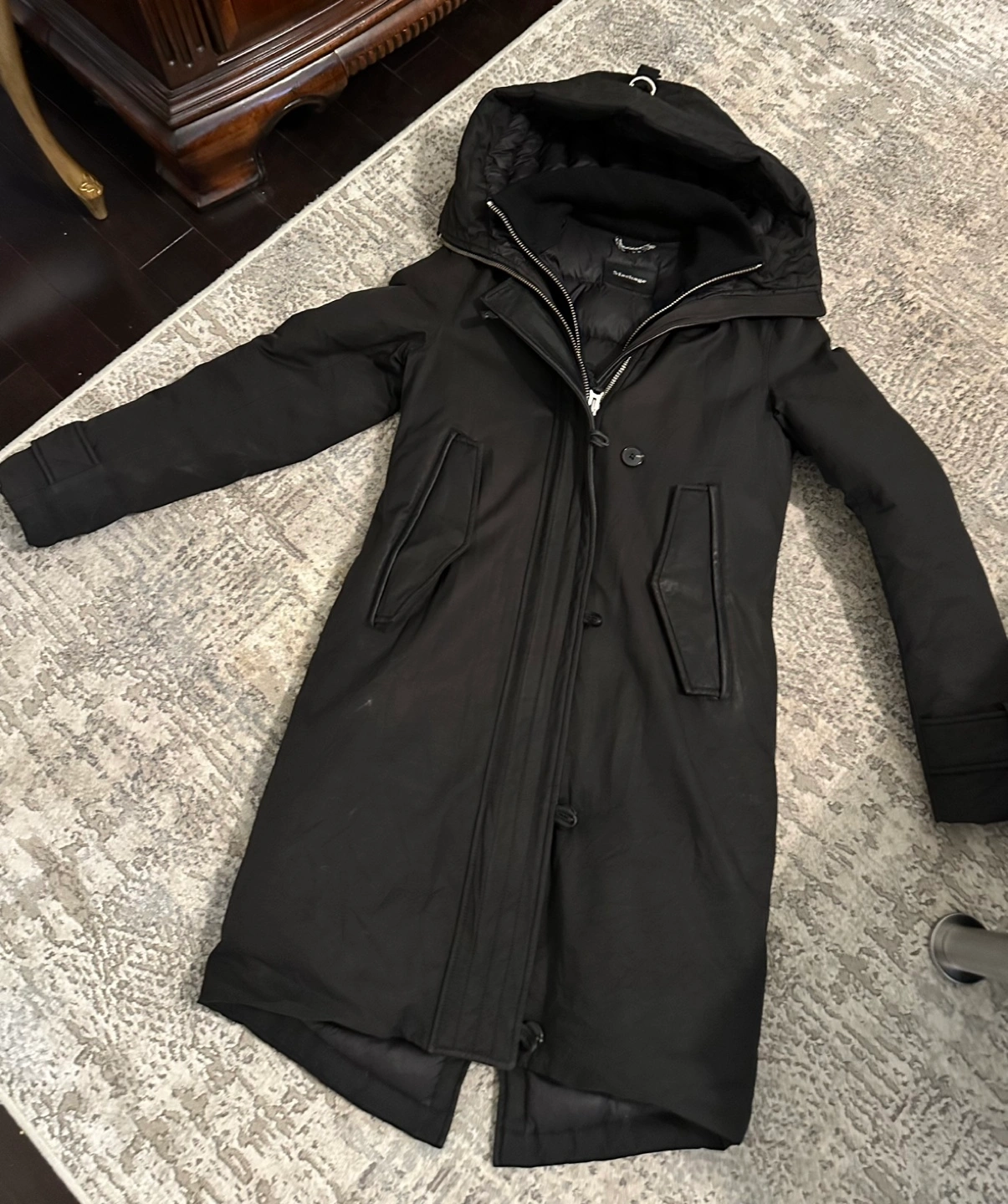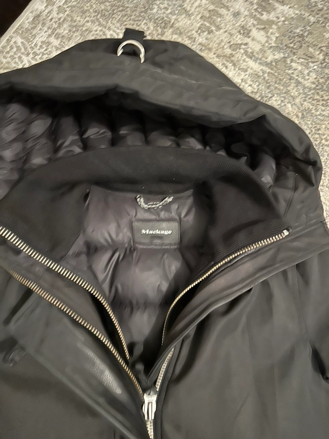Long black winter jacket with a hood. The jacket is padded with down and has a zipper and button closure. It has two front pockets.