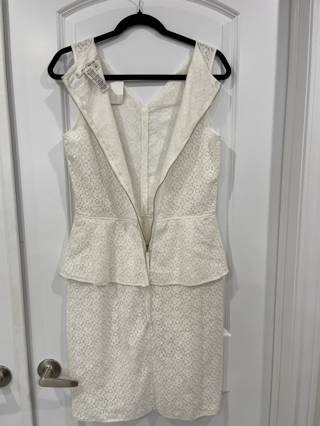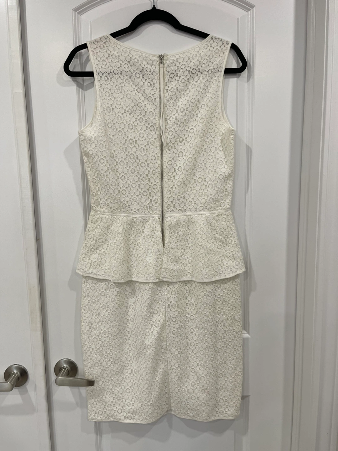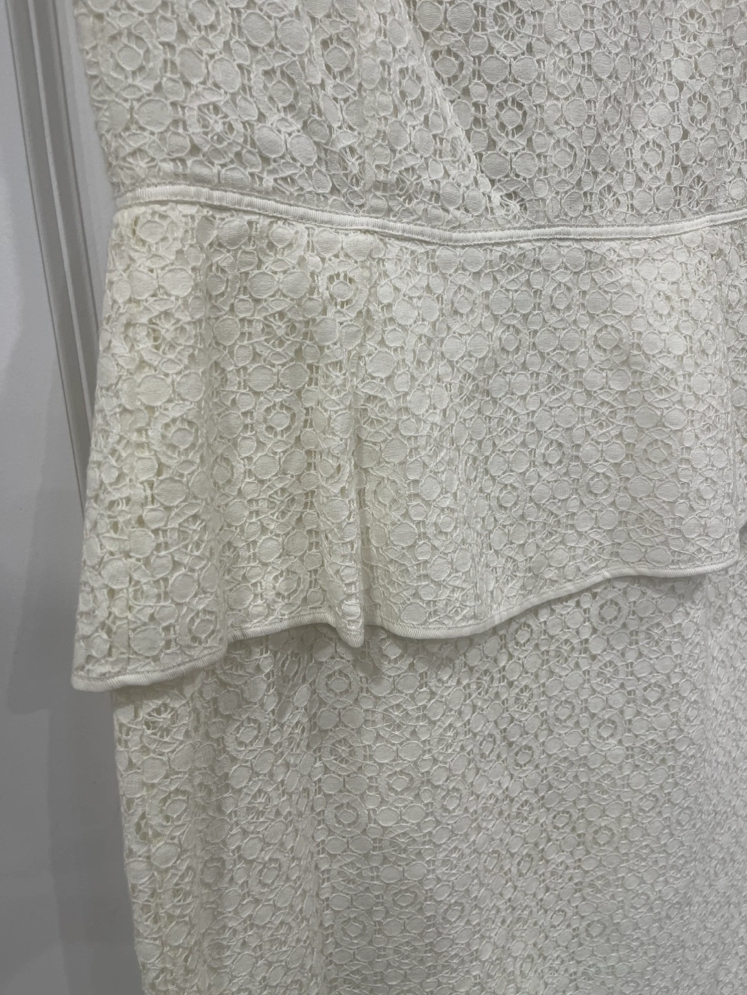 White lace dress with a fitted bodice and a ruffle at the waist. Sleeveless, with a V-neckline. Back zipper closure.