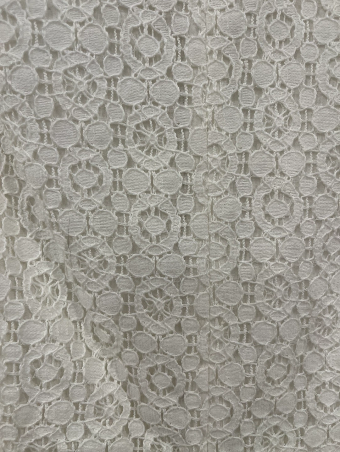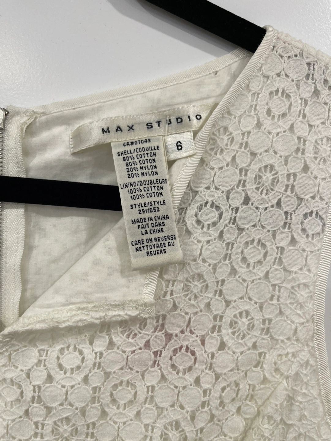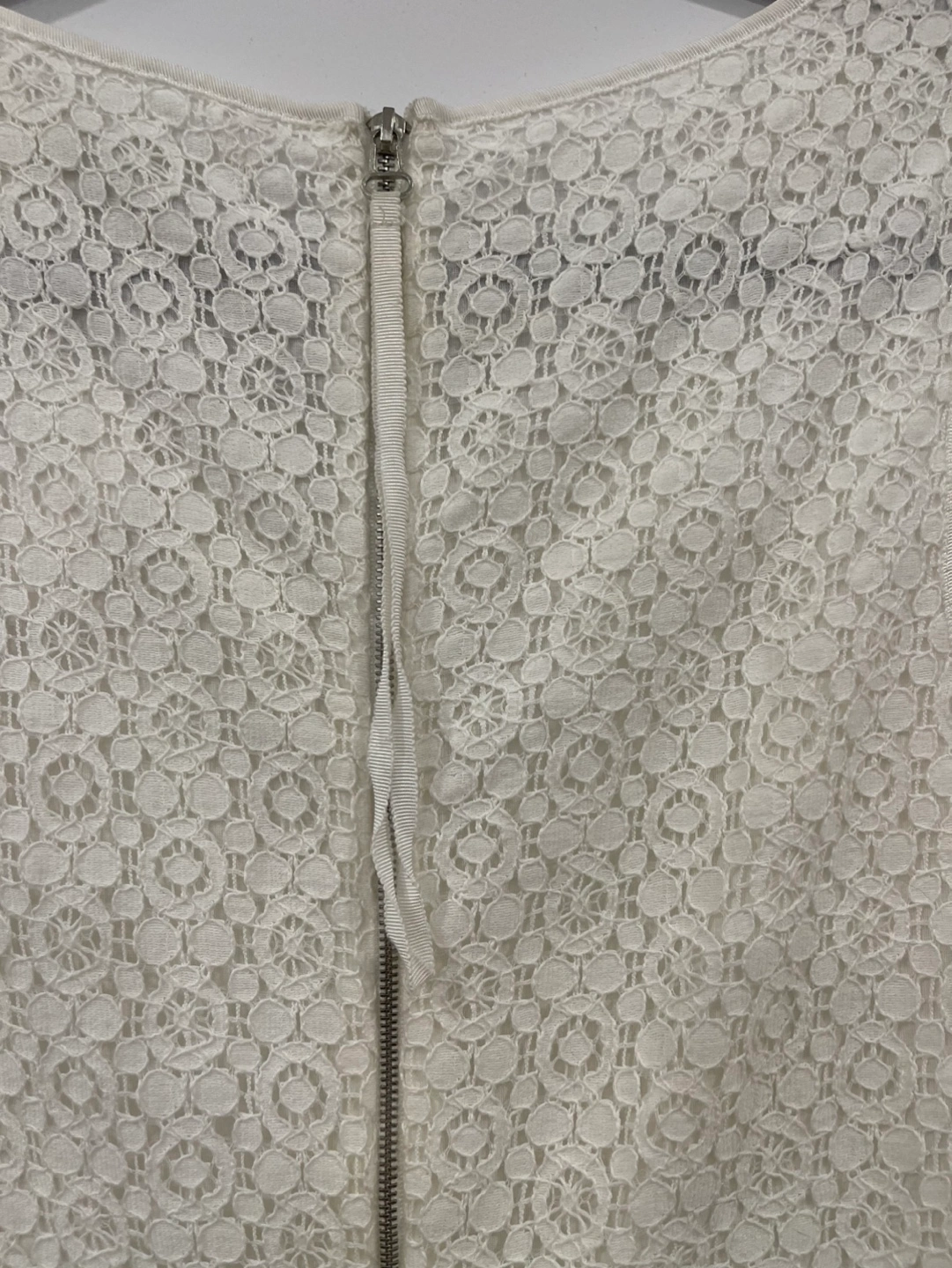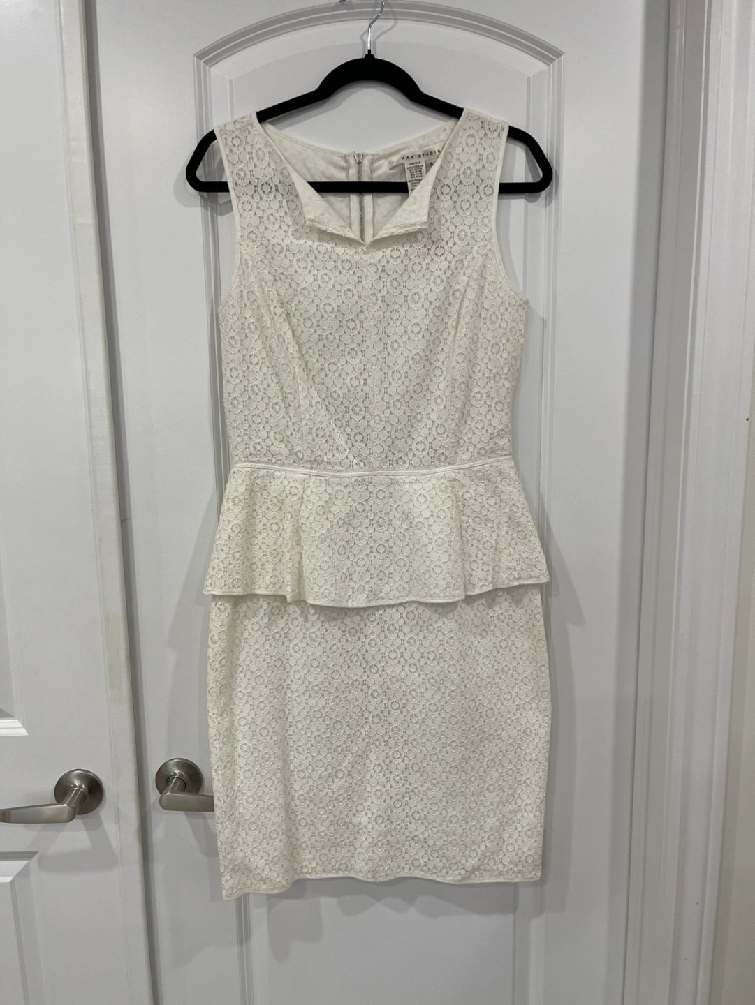 White lace dress with a fitted bodice and a ruffle at the waist. Sleeveless, with a V-neckline. Back zipper closure.
