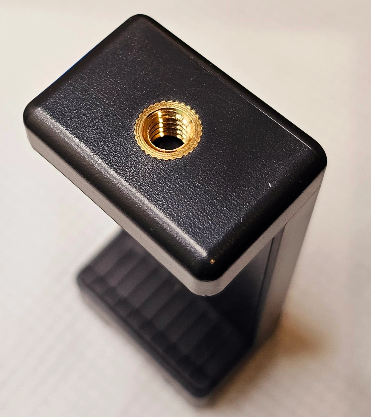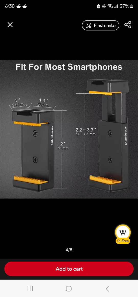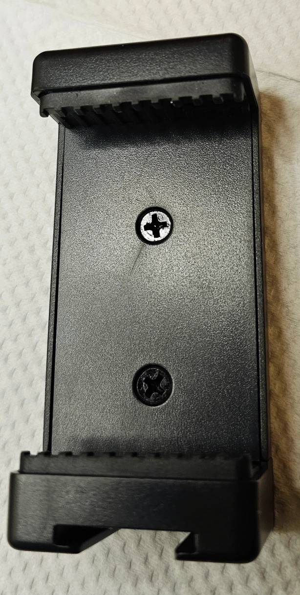 Smartphone mount with a standard 1/4 inch tripod screw. The mount is adjustable to fit most smartphones.