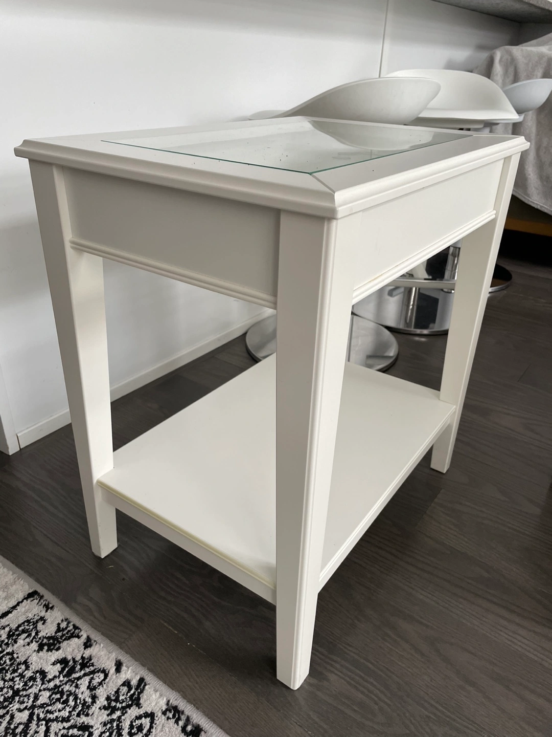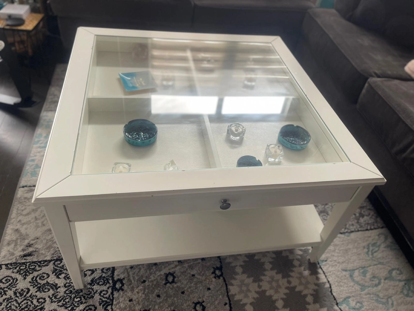White coffee table with a glass top and a drawer. The table has a lower shelf for storage. The two tables are sold together one small and the other is larger. The small one is in a great condition while the larger one is a bit scratched.