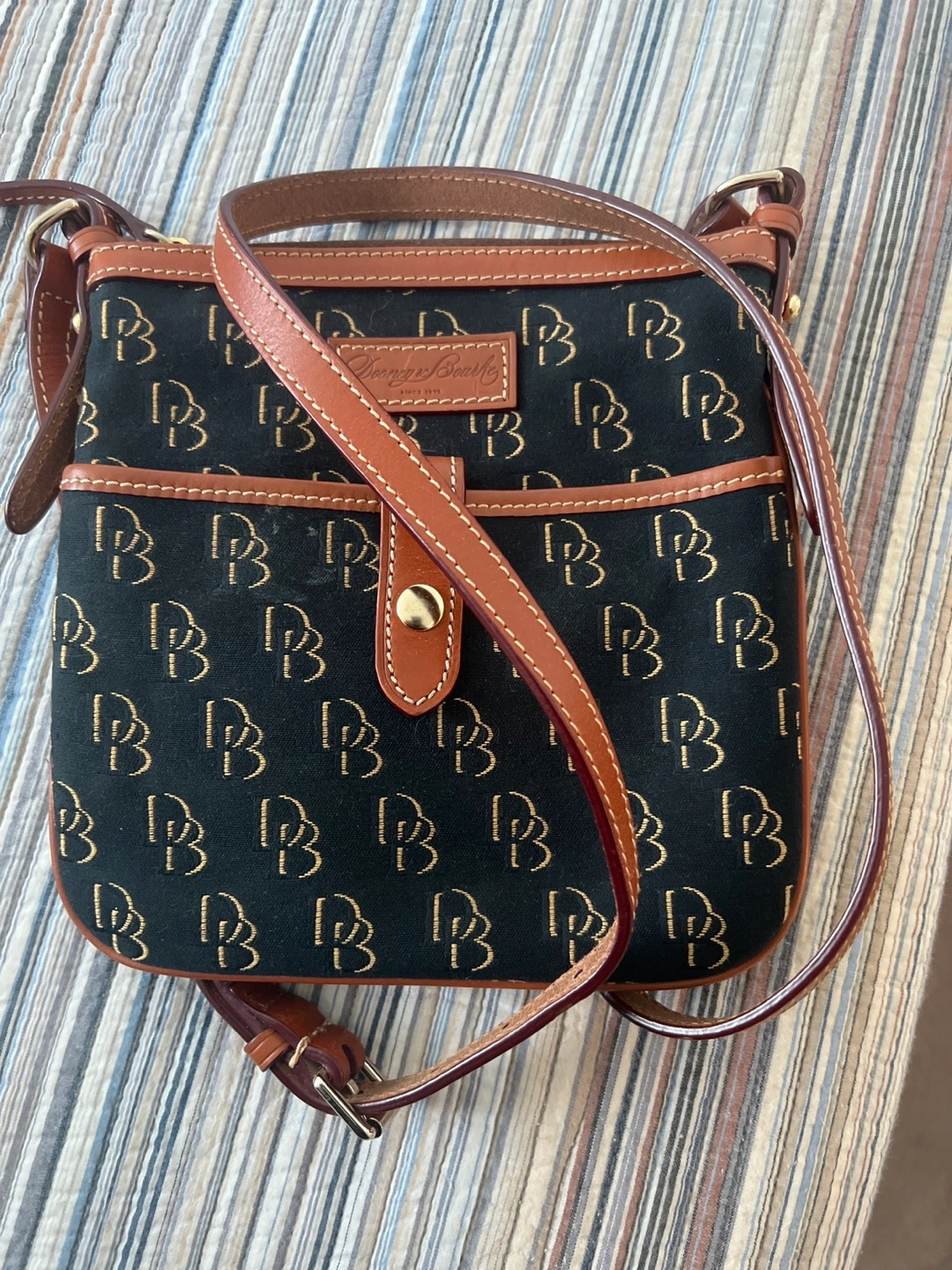 Small crossbody bag with brown strap. Black fabric with gold Dooney & Bourke logo pattern.