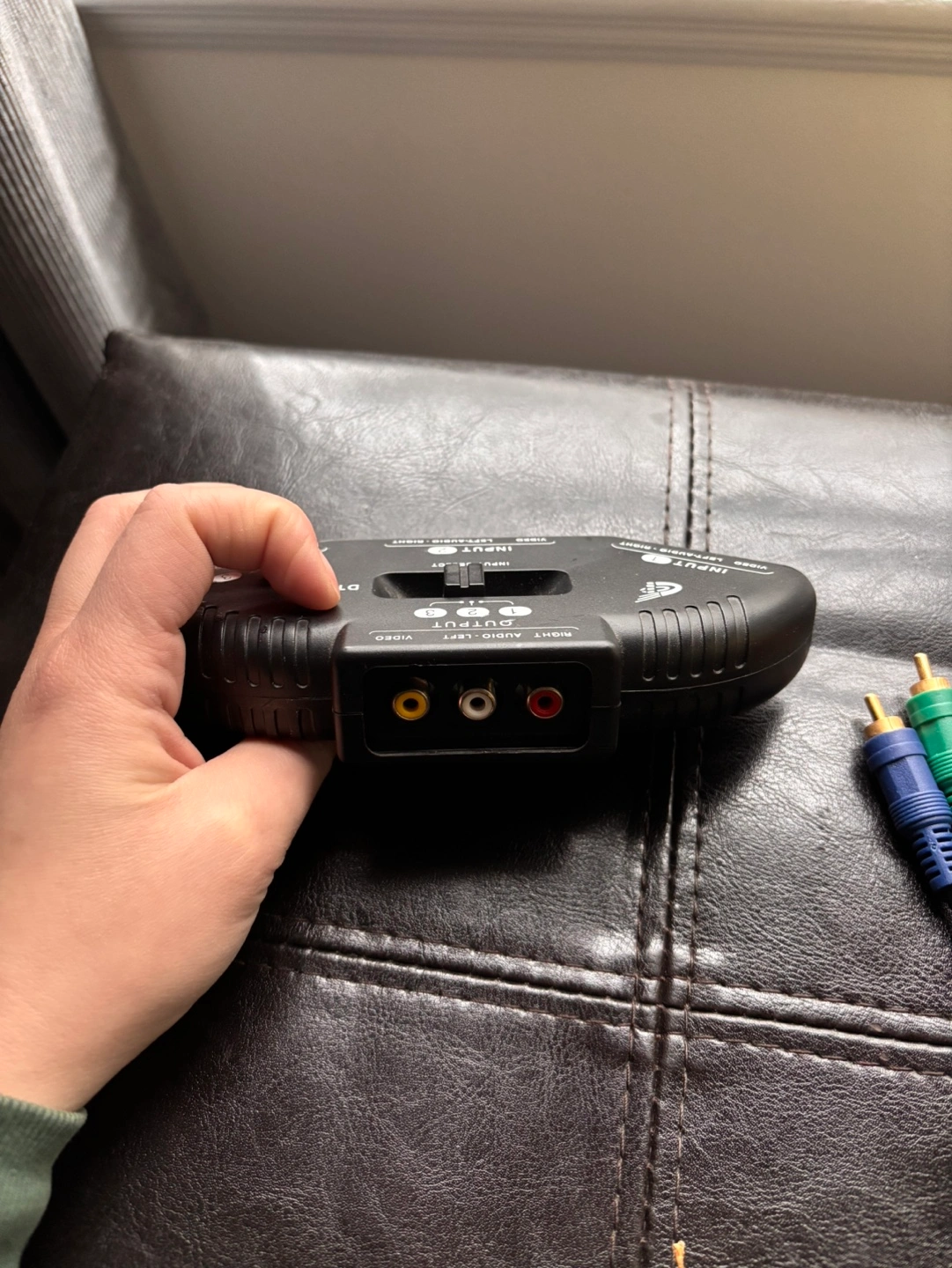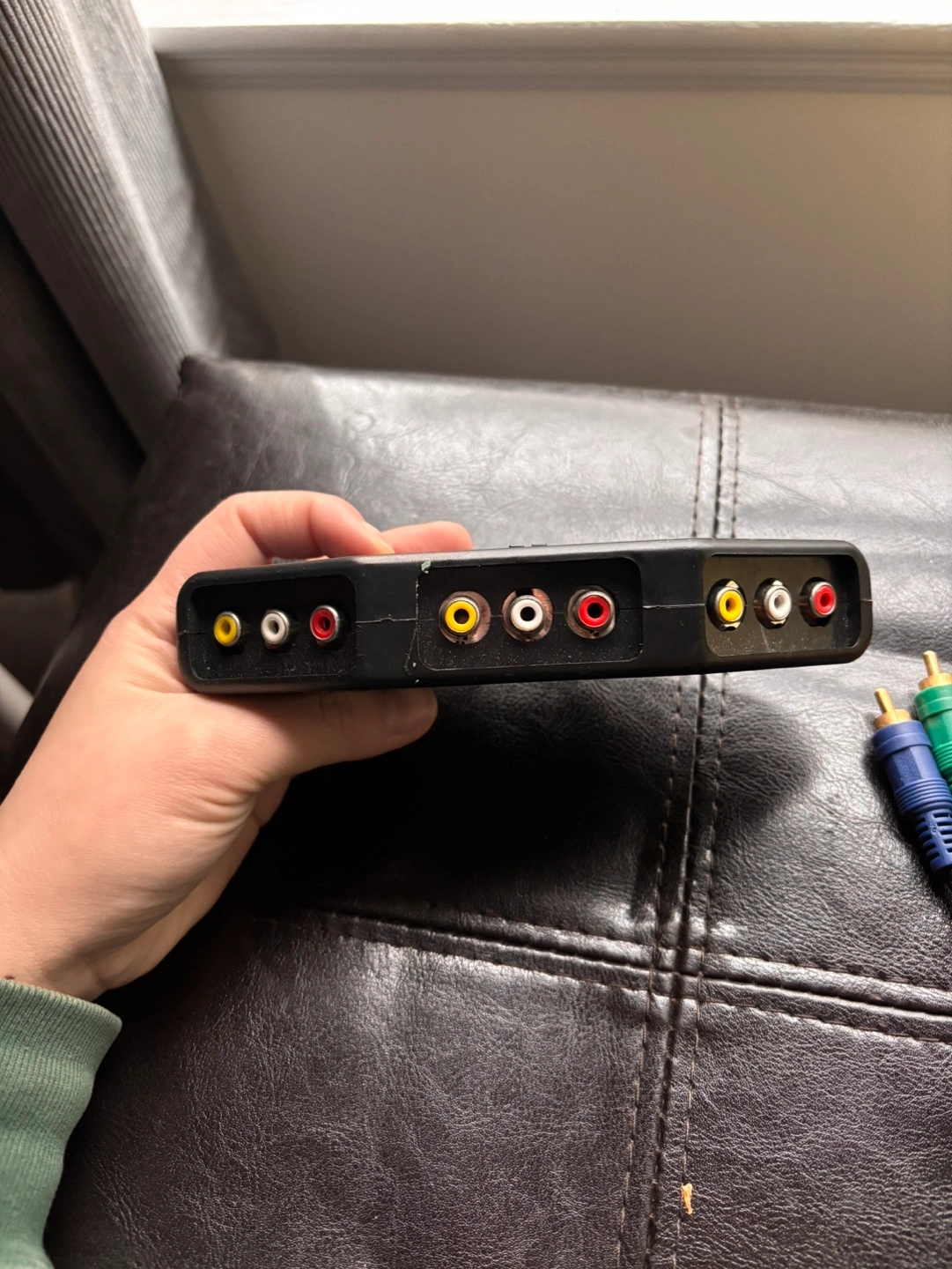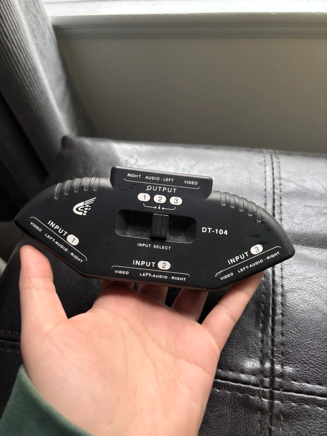 3-way RCA AV switch. Allows you to switch between three RCA input devices. Includes a manual switch to select which input is active. Includes one set of RCA cables.