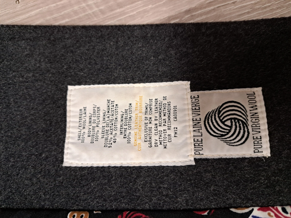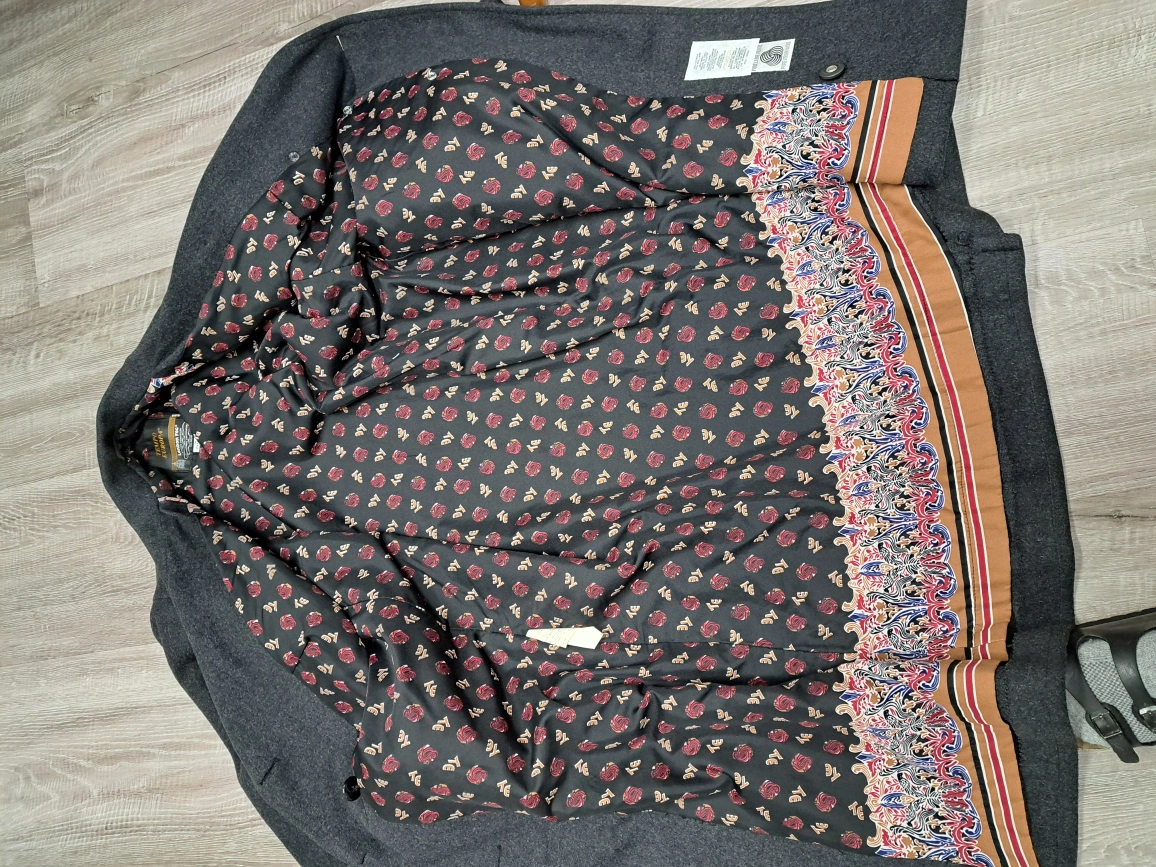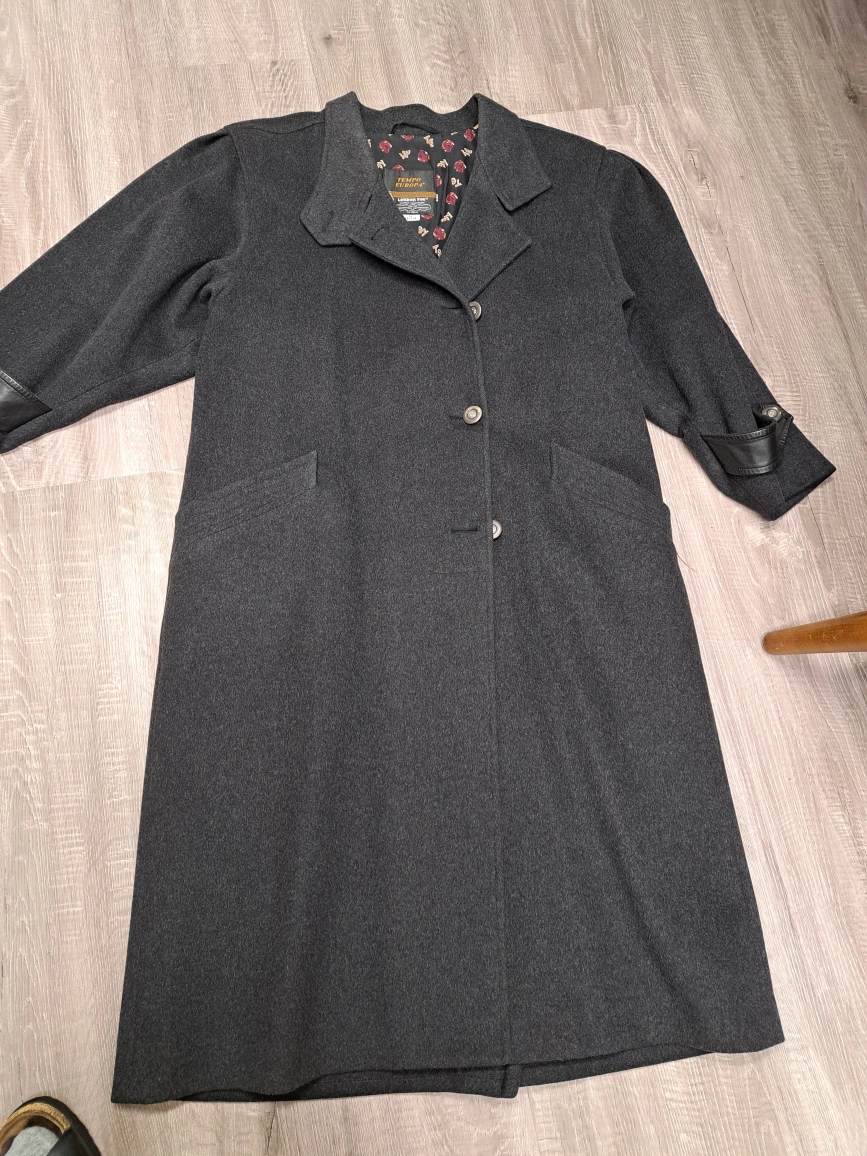 Long grey wool coat with a floral patterned lining. Features two pockets and leather accents on the sleeves. Has a single button closure on outside and o e inside. There is a shammy accross the shoulders. Very Warm.