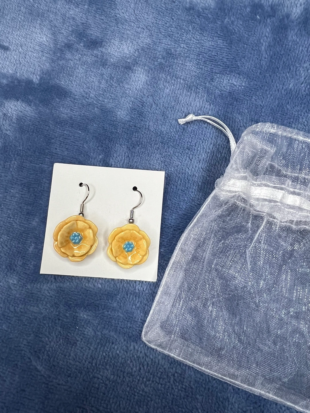 Yellow ceramic flower earrings with blue centres. Silver hooks.