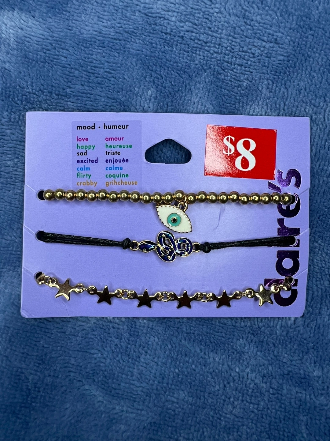 Three gold chain bracelets, one with a blue evil eye charm, one with a blue snake charm, and one with star charms.
