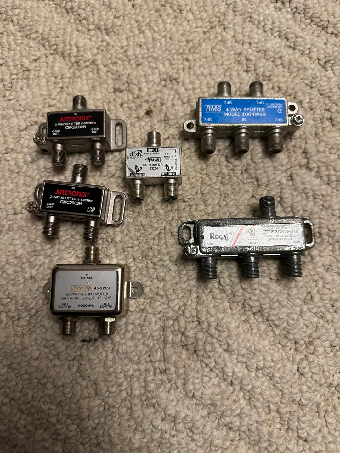 Assortment of coax cable splitters. Includes two-way and four-way splitters. All in good condition.