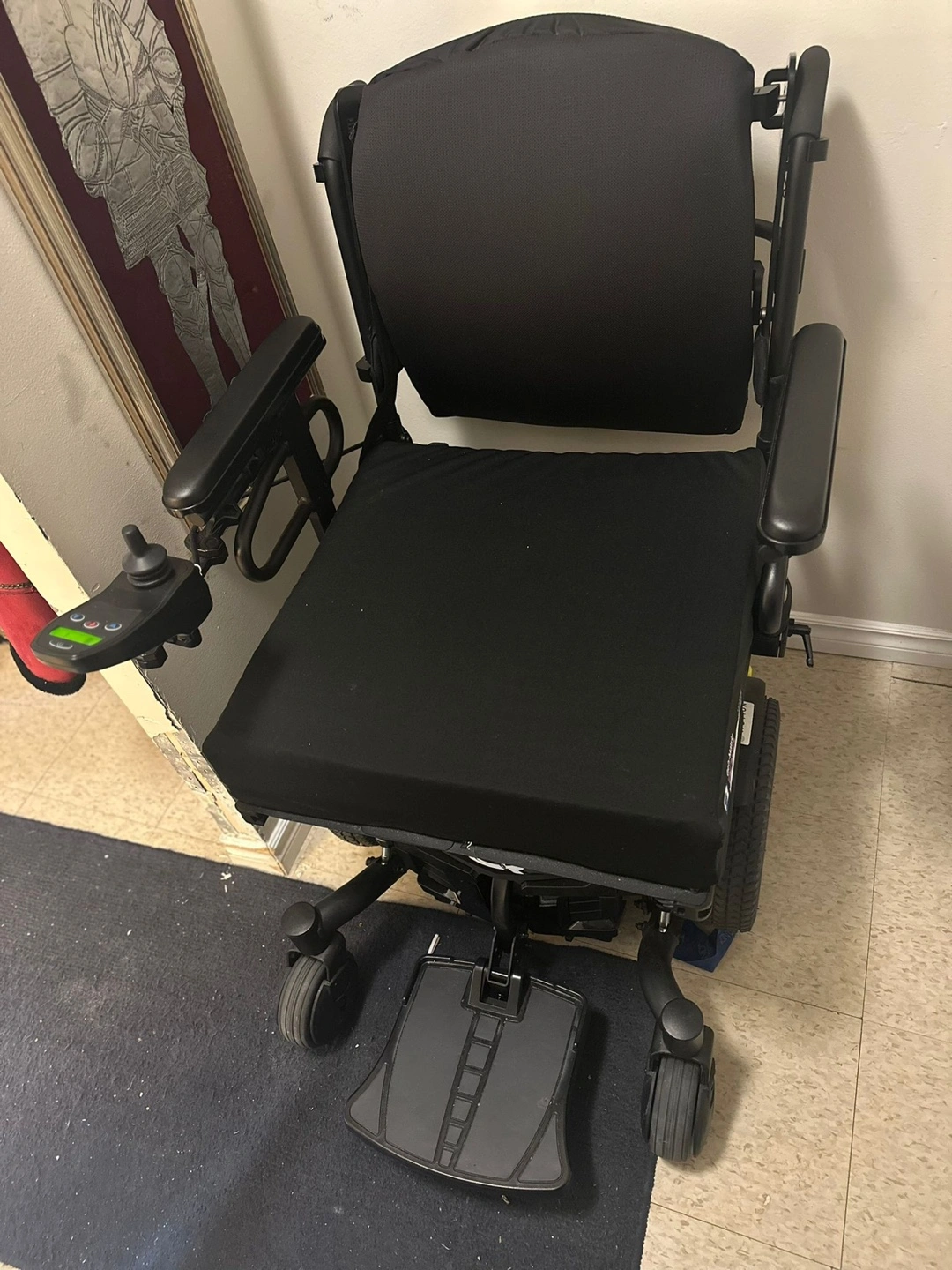 Power electric wheelchair with a black frame and seat. It has a control panel and comes with a removable seat cushion. 1 year old and was only used a few times.