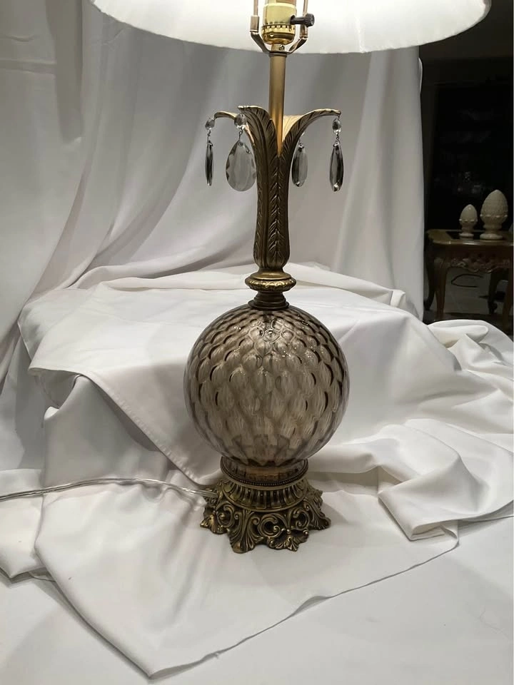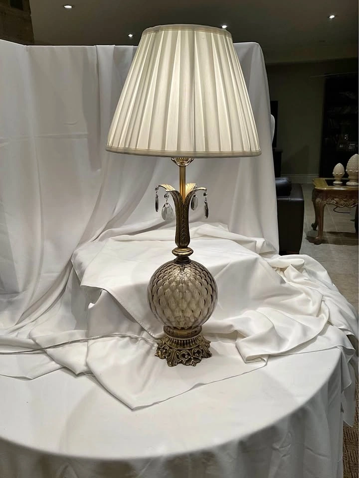 Beautiful vintage Hollywood table lamp from the 1960s. Features a glass bubble center in amber. In pristine condition from a smoke and pet-free home. Located in Richmond Hill near Bathurst & King Rd.